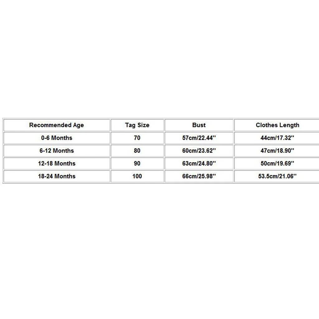 Рекомендуемый возраст Тег Размеры Обхват груди Одежда Длина Для детей от 0 до 6 месяцев 70 57 см/22,44'' 44 см/17,32'' 6-12 месяцев 80 60 см/23,62'' 47 см/18,90'' 12-18 месяцев 90 63 см/24,80'' 50 см/19,69'' 18-24 месяцев 100 66 см/25,98'' 53,5 см/21,06''