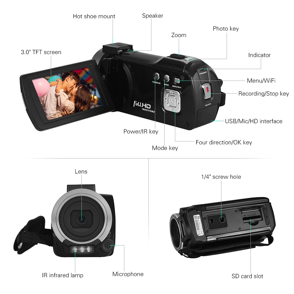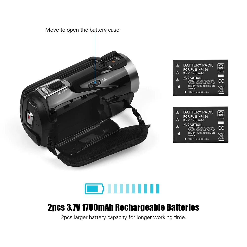 С слотом для sd-карты, поддержка карты SD/SDHC класса 6 или выше, Макс. память 32 GB (не входит в комплект); поставляется с 2 шт. перезаряжаемый аккумулятор и зарядное устройство для дольше время ношения; с пультом дистанционного управления для регулировки базовыми функциями, очень удобный для использования.