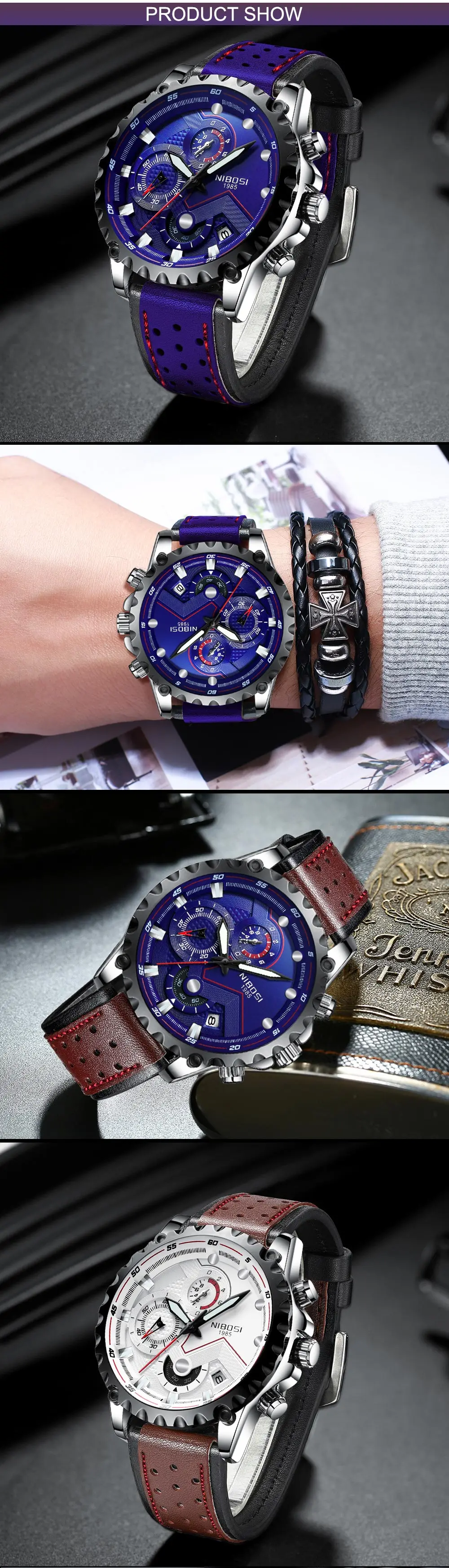 NIBOSI Top Brand Luxury Blue Mens Watches Great Lether Strap Chronograph Waterproof Quartz Business Men Watch Relogio Masculino