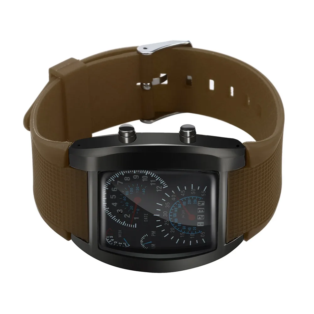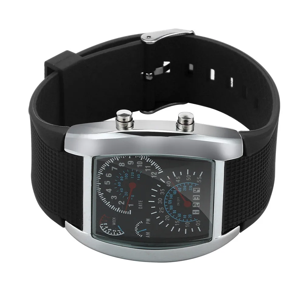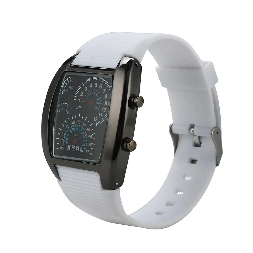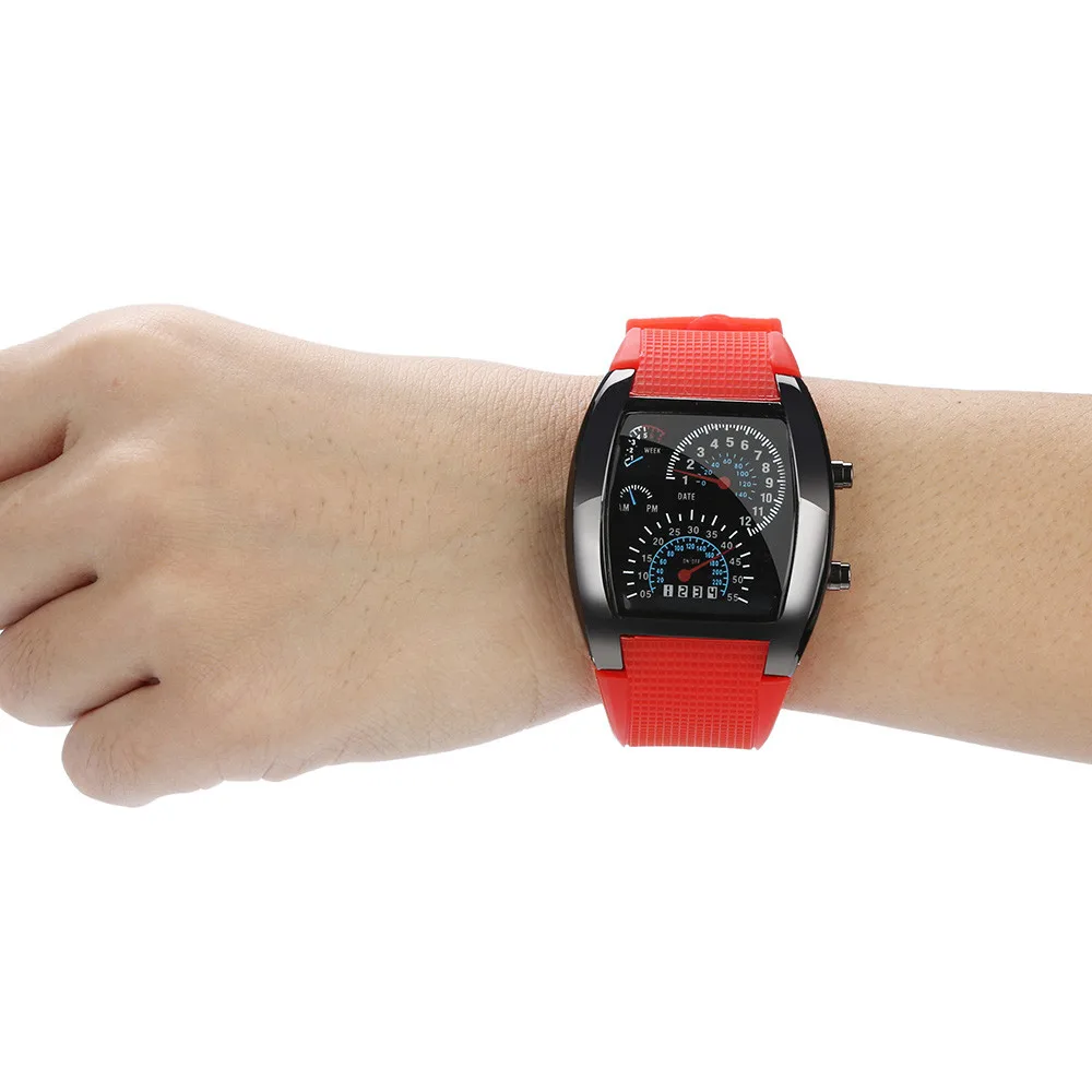 Ощущайте потребность в скорости, используя эти высококачественные цифровые светодиодный спортивные часы. Это время занимает от нулевой до шестидесяти в течение одного часа, гарантируя, что вы будете в порядке вовремя на каждой остановке ямы в ваш быстрый день. Имитируя внешний вид автомобильного спидометра, эти часы оснащены функциями времени, даты и дня, которые легко обрабатываются, когда требуется подгонка в соответствии с вашими нуждами. Вы даже можете превратить Дальний свет включения или выключения, регулировка яркости светодиодный свет. Эти наручные часы быстро и яростно двигаются, и они никогда не переворачиваются.