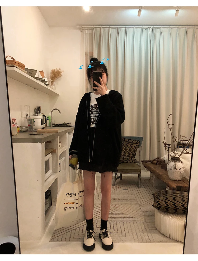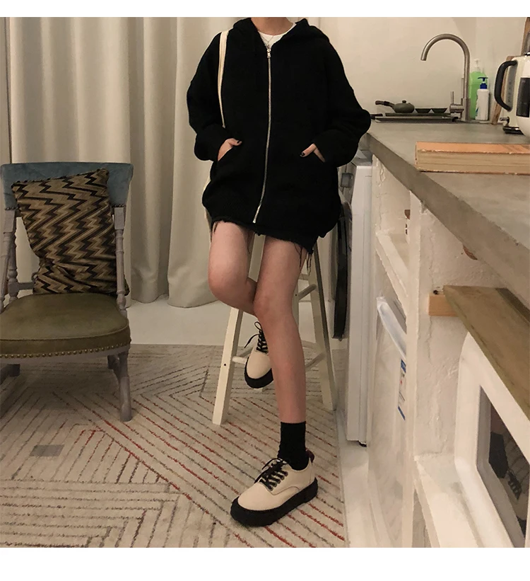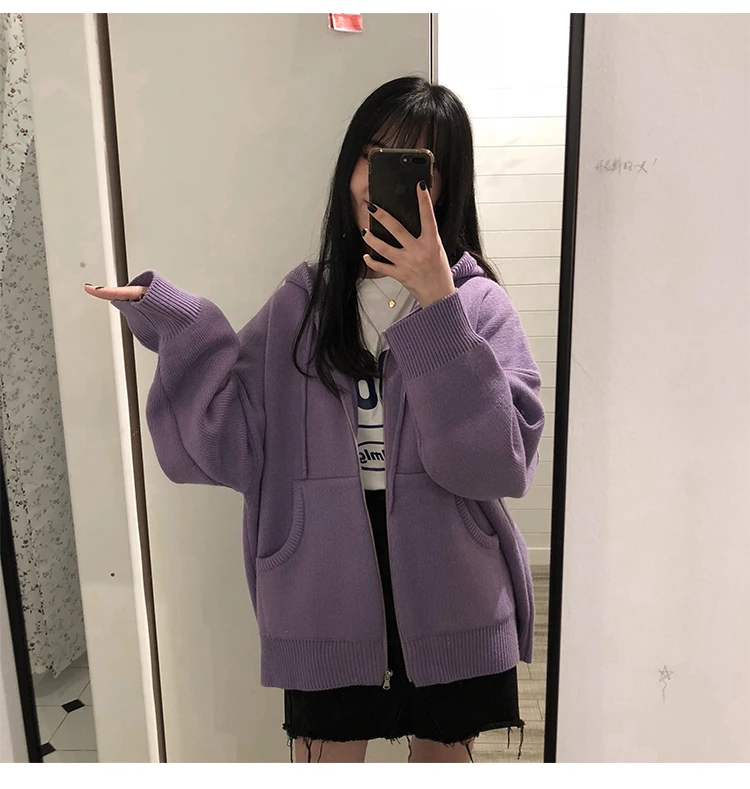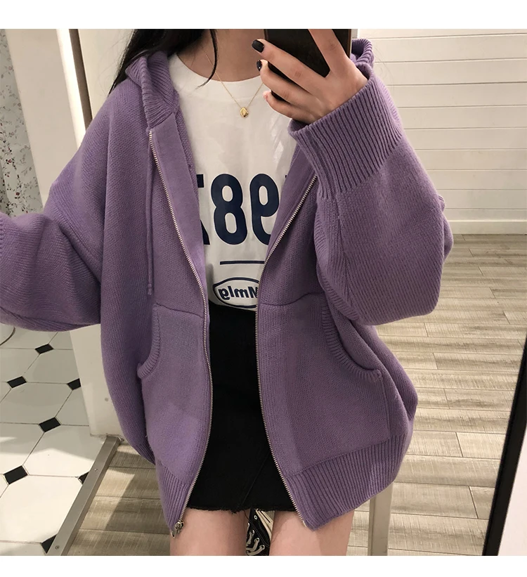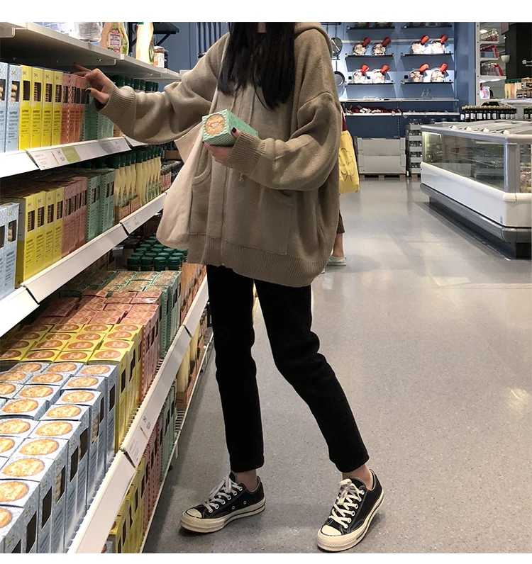 Кардиган, женский зимний джемпер с капюшоном, однотонный корейский винтажный свитер, верхняя одежда, кардиган оверсайз, куртка на молнии в стиле Харадзюку V807