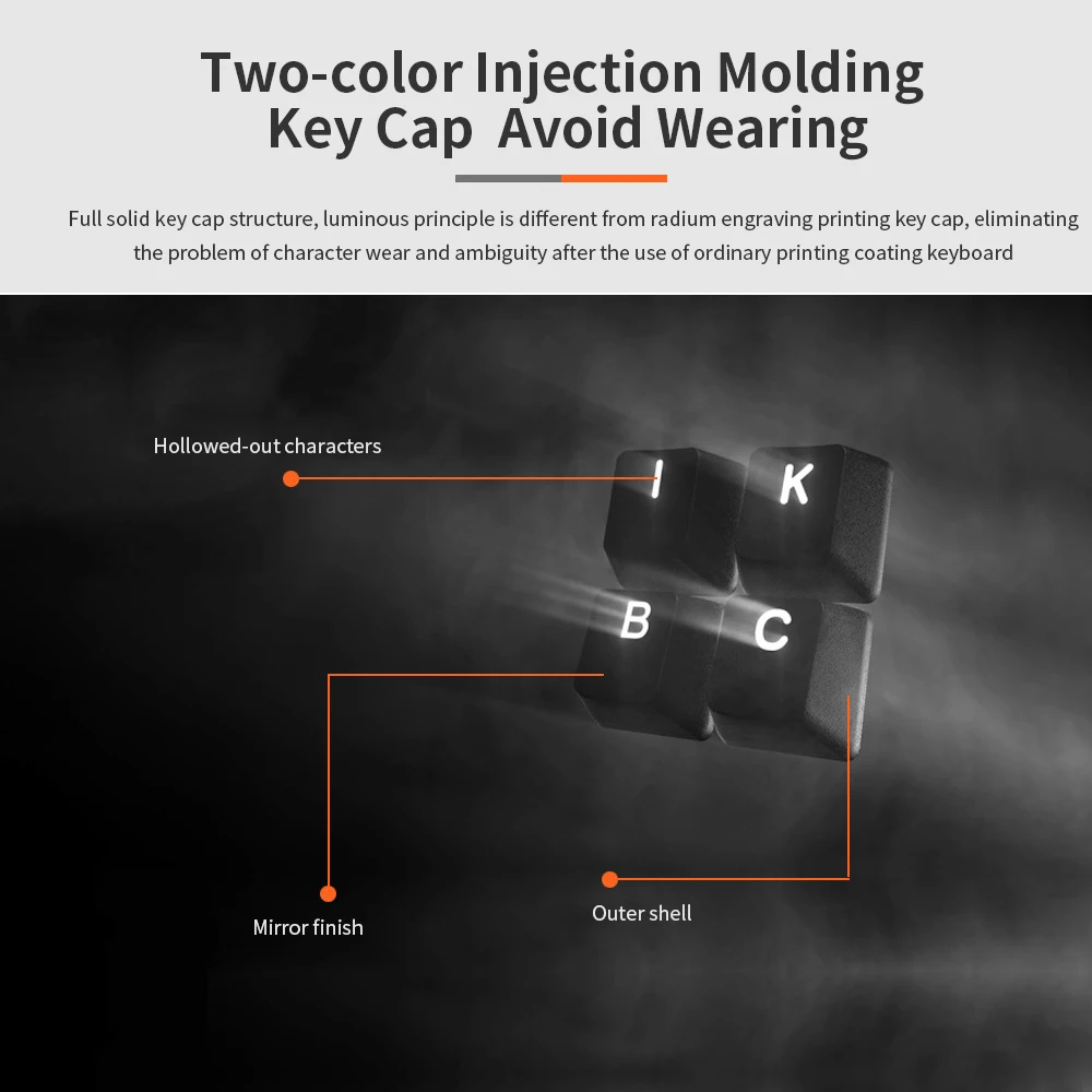 Полностью прочная конструкция крышки ключа, светящийся принцип отличается от радиевого гравировального печатного ключа, устраняя проблему износа персонажа и неясности после использования обычной клавиатуры с печатным покрытием.