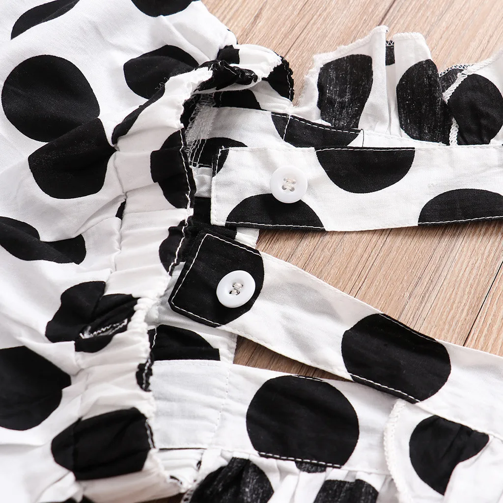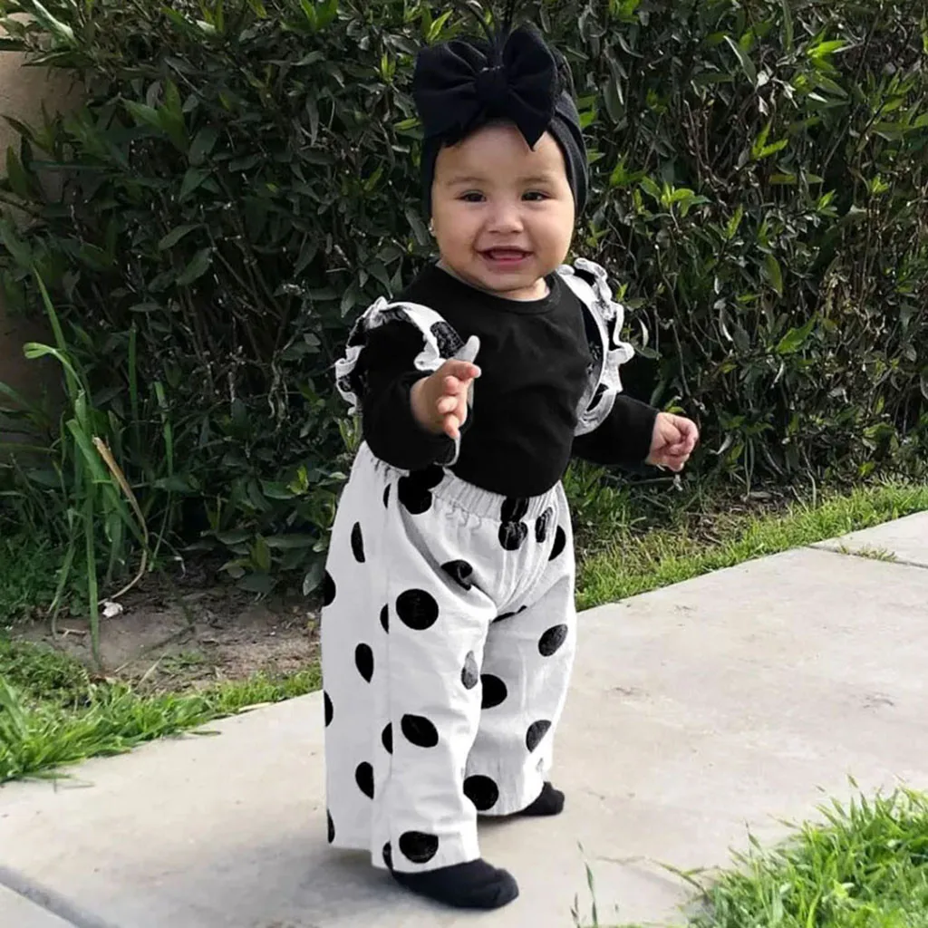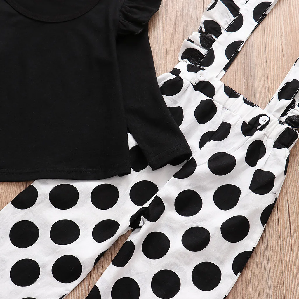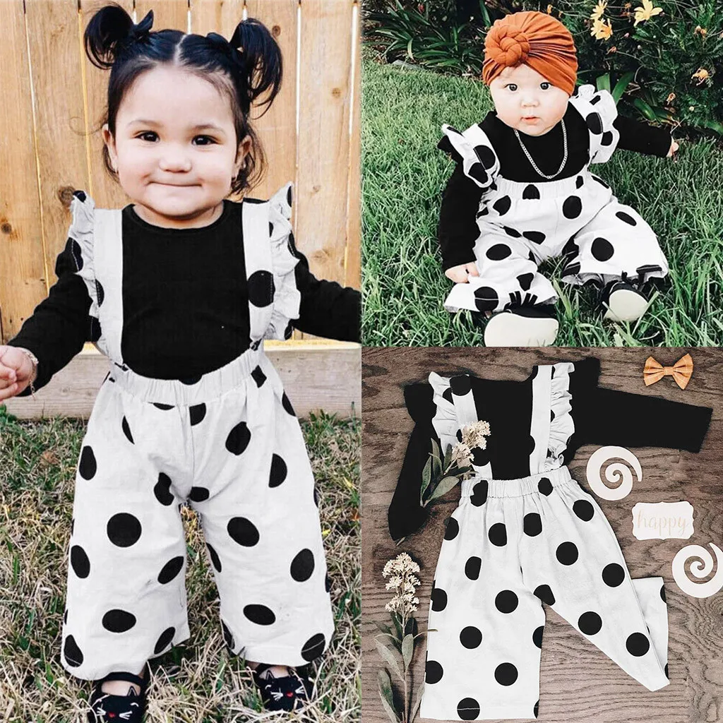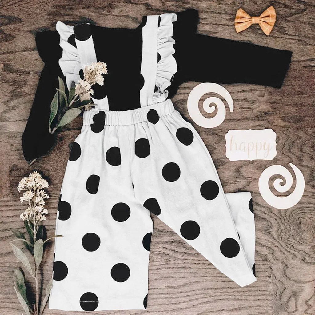 Однотонная футболка с оборками для маленьких девочек топы + штаны на подтяжках в горошек