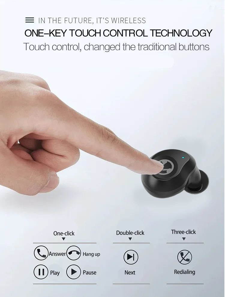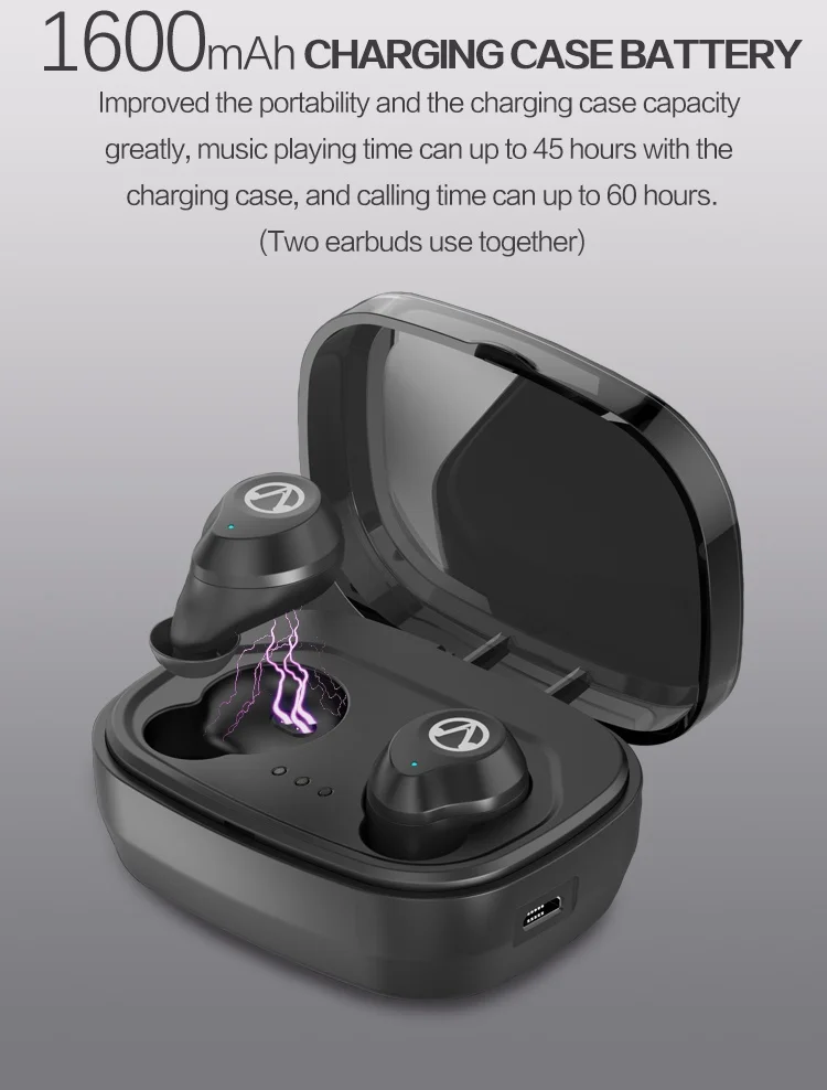 Функция: 1. Автоматическое включение/выключение 2. Сенсорное управление 3.IPX7 deepth водонепроницаемый 4. Бинауральные вызова 5. Голосовое управление Siri 6. Зарядный кабель мобильного телефона подключен к зарядному устройству для зарядки телефона 7. Одна гарнитура соединяет два мобильных телефона с Bluetooth 8. Пауза/воспроизведение: Коснитесь гарнитуры один раз 9. Следующая песня: Коснитесь гарнитуры два раза Спецификация: Версия Bluetooth: V 5,0 Программа: Airaho 1526P Зарядное устройство: 1600 мА · ч Гарнитуры: 50 мА · ч Время работы: 3 часа. Степень водонепроницаемости: IPX7 Цвет: черный и белый