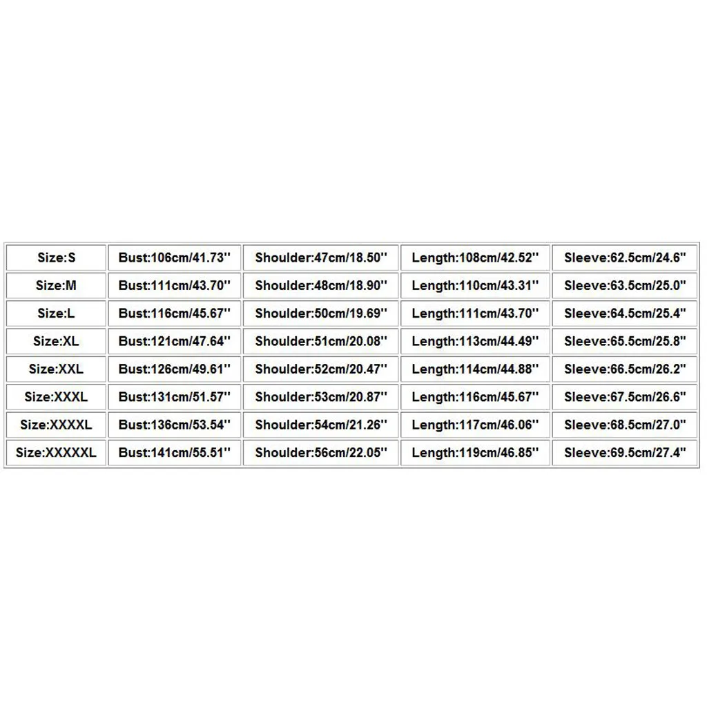 Размеры Бюст Плечо Длина Рукав S 106 см/41,73 дюйма 47 см/18,50 дюйма 108 см/42,52 дюйма 62,5 см/24,6 дюйма М 111 см/43,70 дюйма 48 см/18,90 дюйма 110 см/43,31 дюйма 63,5 см/25,0 дюйма L 116 см/45,67 дюйма 50 см/19,69 дюйма 111 см/43,70 дюйма 64,5 см/25,4 дюйма XL 121 см/47,64 дюйма 51 см/20,08 дюйма 113 см/44,49 дюйма 65,5 см/25,8 дюйма XXL 126 см/49,61 дюйма 52 см/20,47 дюйма 114 см/44,88 дюйма 66,5 см/26,2 дюйма XХХL 131 см/51,57 дюйма 53 см/20,87 дюйма 116 см/45,67 дюйма 67,5 см/26,6 дюйма XXXXL 136 см/53,54 дюйма 54 см/21,26 дюйма 117 см/46,06 дюйма 68,5 см/27,0 дюйма XXXXXL 141 см/55,51 дюйма 56 см/22,05 дюйма 119 см/46,85 дюйма 69,5 см/27,4 дюйма
