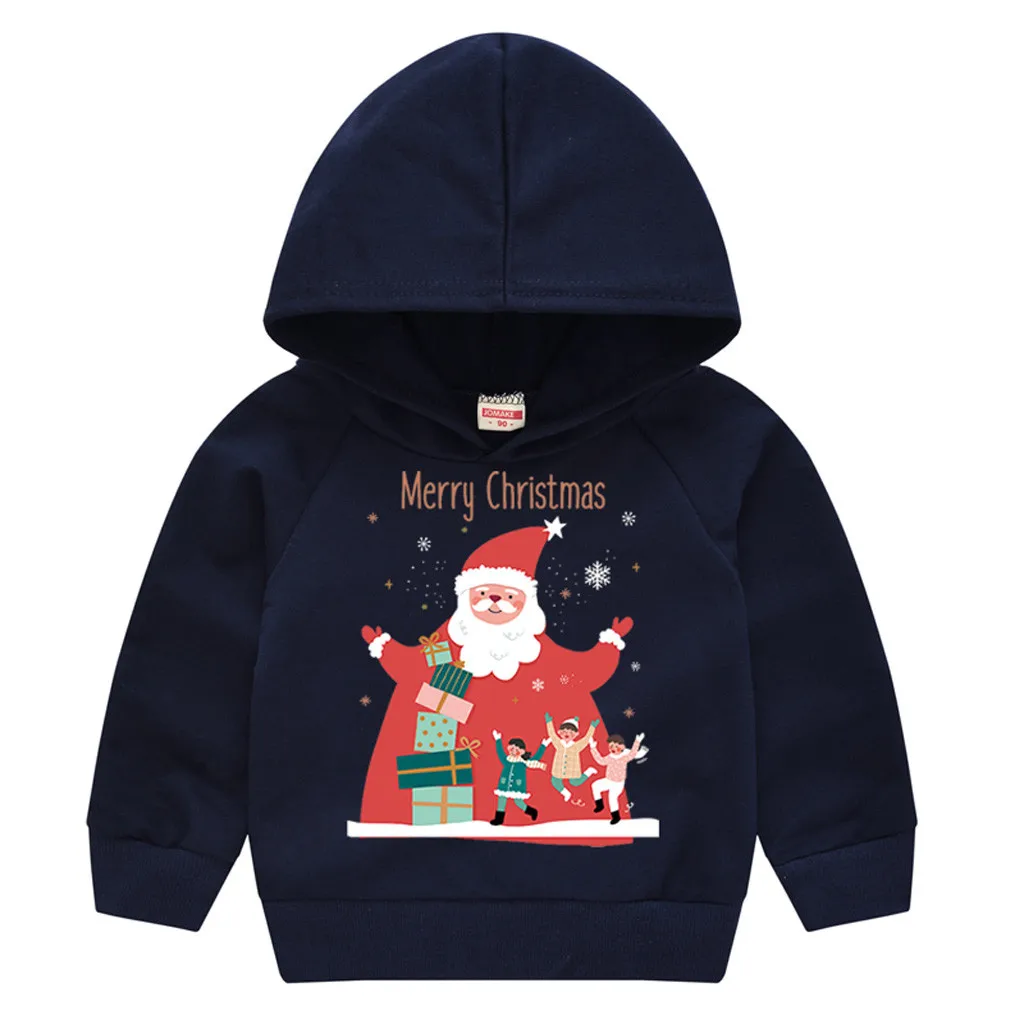 ОписаниеРождественский свитер с капюшоном и Санта-Клаусом для маленьких мальчиков и девочек, топы, футболка