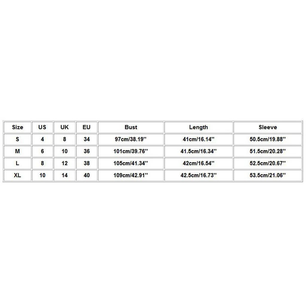 Size US UK EU Bust Length Sleeve S 4 8 34 97cm/38.19'' 41cm/16.14'' 50.5cm/19.88'' M 6 10 36 101cm/39.76'' 41.5cm/16.34'' 51.5cm/20.28'' L 8 12 38 105cm/41.34'' 42cm/16.54'' 52.5cm/20.67'' XL 10 14 40 109cm/42.91'' 42.5cm/16.73'' 53.5cm/21.06''