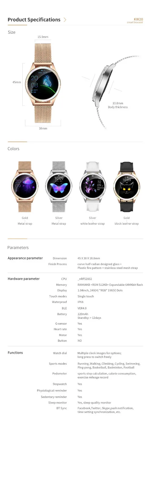 KW20 женские умные часы IP68 водонепроницаемый браслет контроля сна Спорт Фитнес для Android IOS