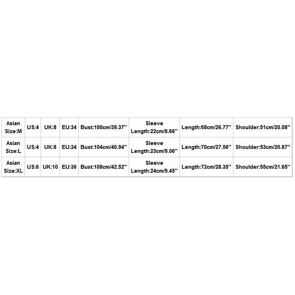 Азиатский размер США UK ЕС Бюст Длина рукава Длина Плечо М 4 8 34 100 см/39,37 дюйма 22 см/8,66 дюйма 68 см/26,77 дюйма 51 см/20,08 дюйма L 4 8 34 104 см/40,94 дюйма 23 см/9,06 дюйма 70 см/27,56 дюйма 53 см/20,87 дюйма XL 6 10 36 108 см/42,52 дюйма 24 см/9,45 дюйма 72 см/28,35 дюйма 55 см/21,65 дюйма