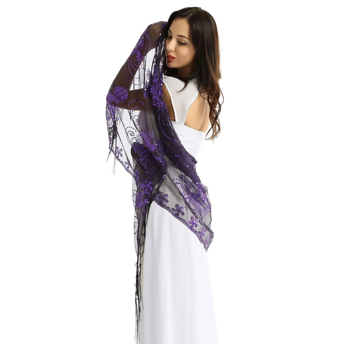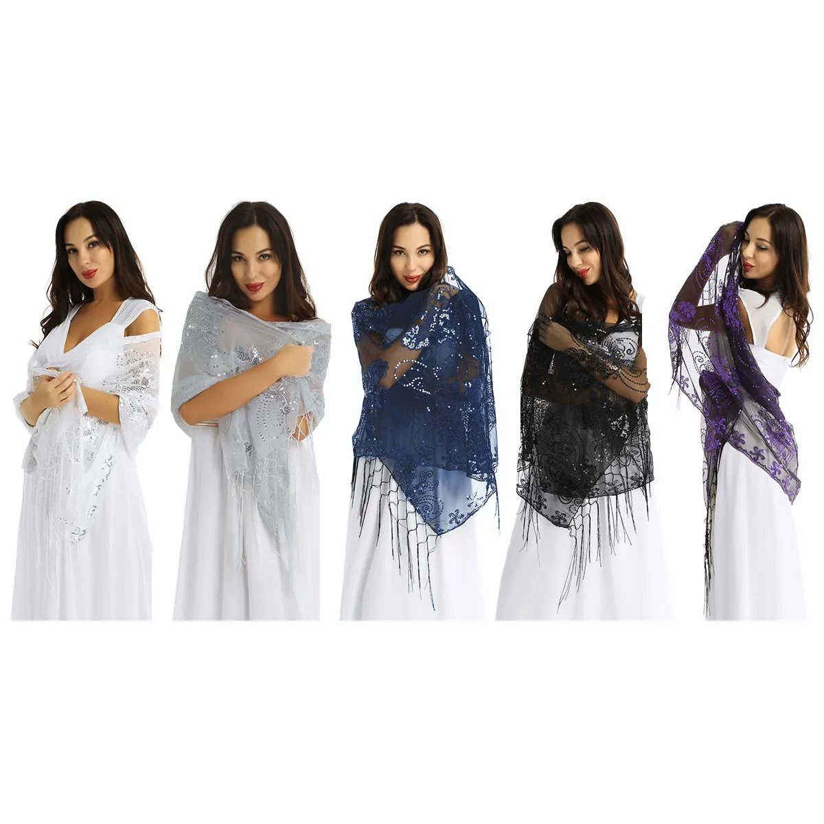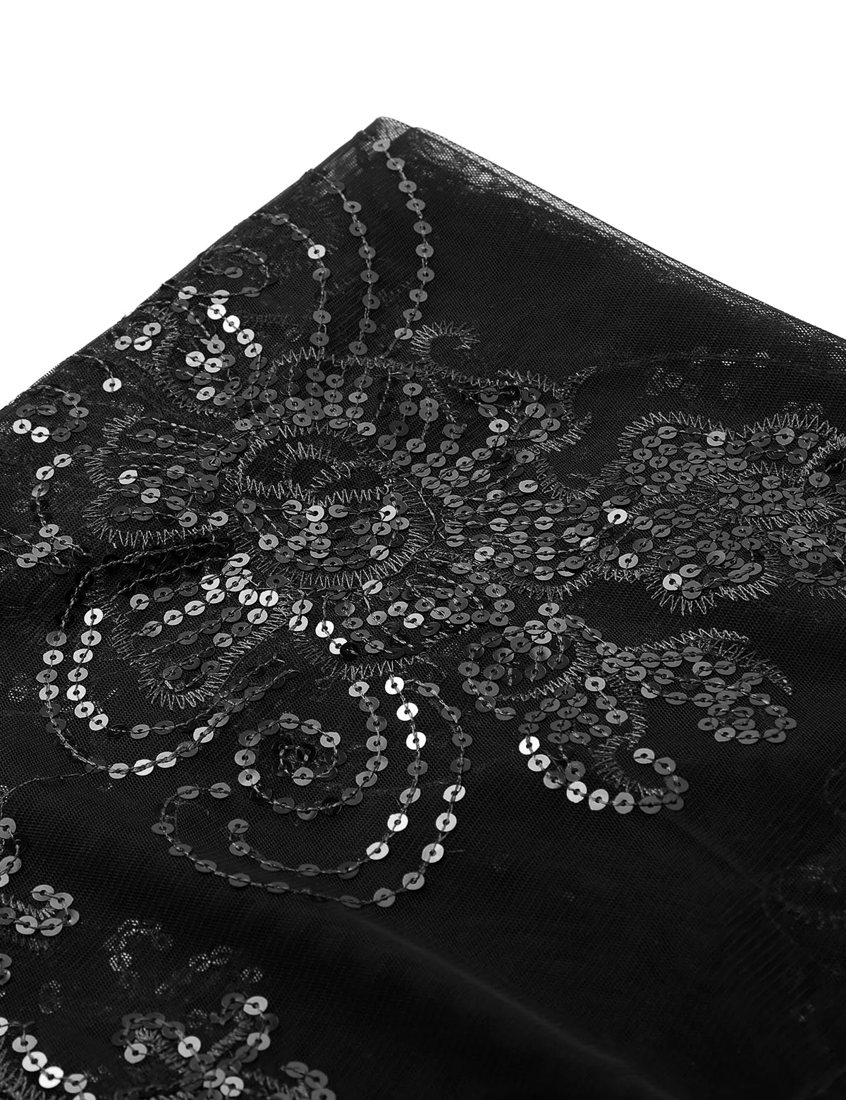 Просвечивайте прозрачную сетку с бахромой по подолу, отделкой пайетками и краями гребешка в различных классических цветах.