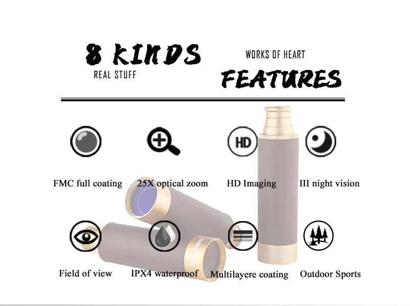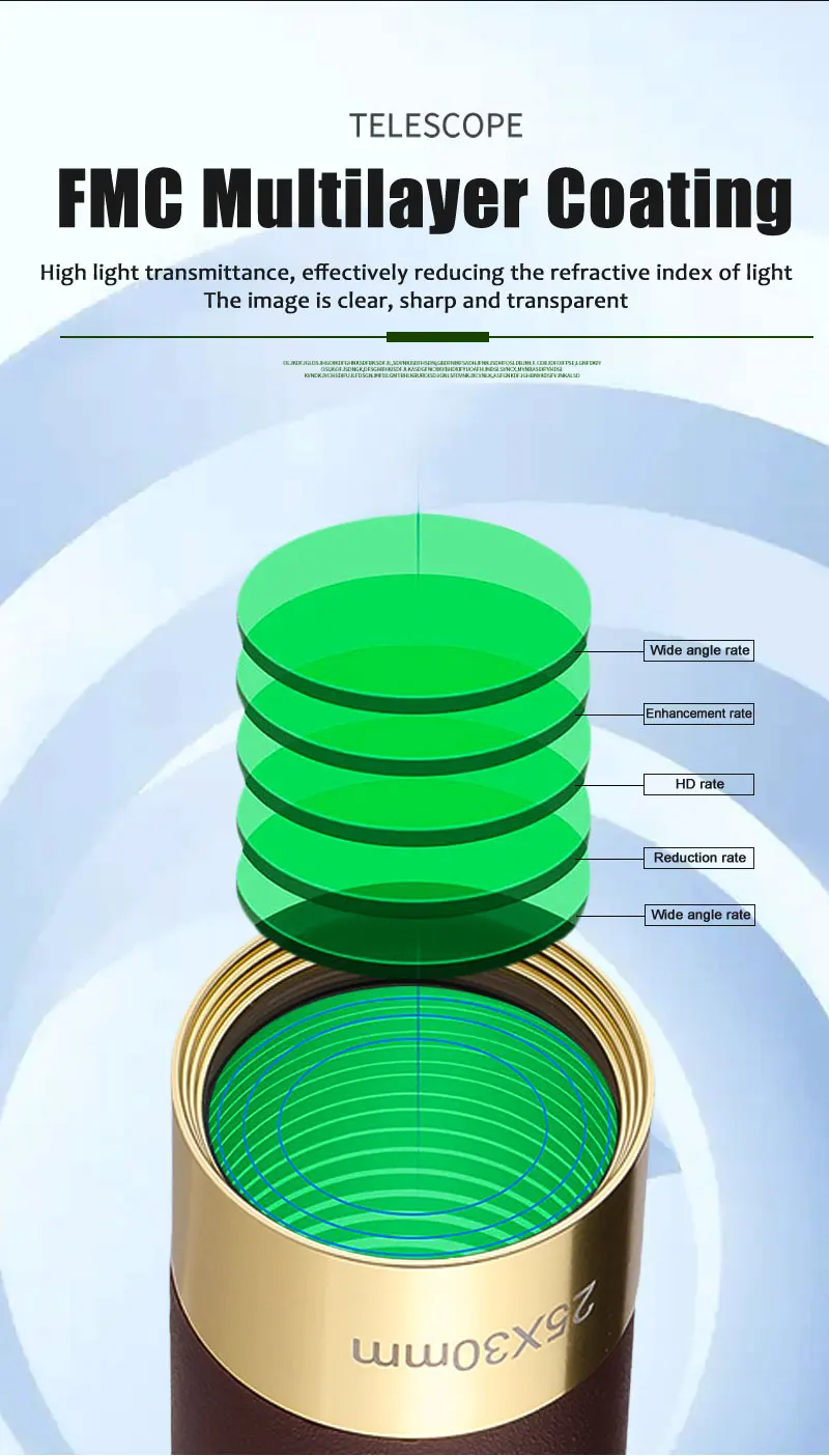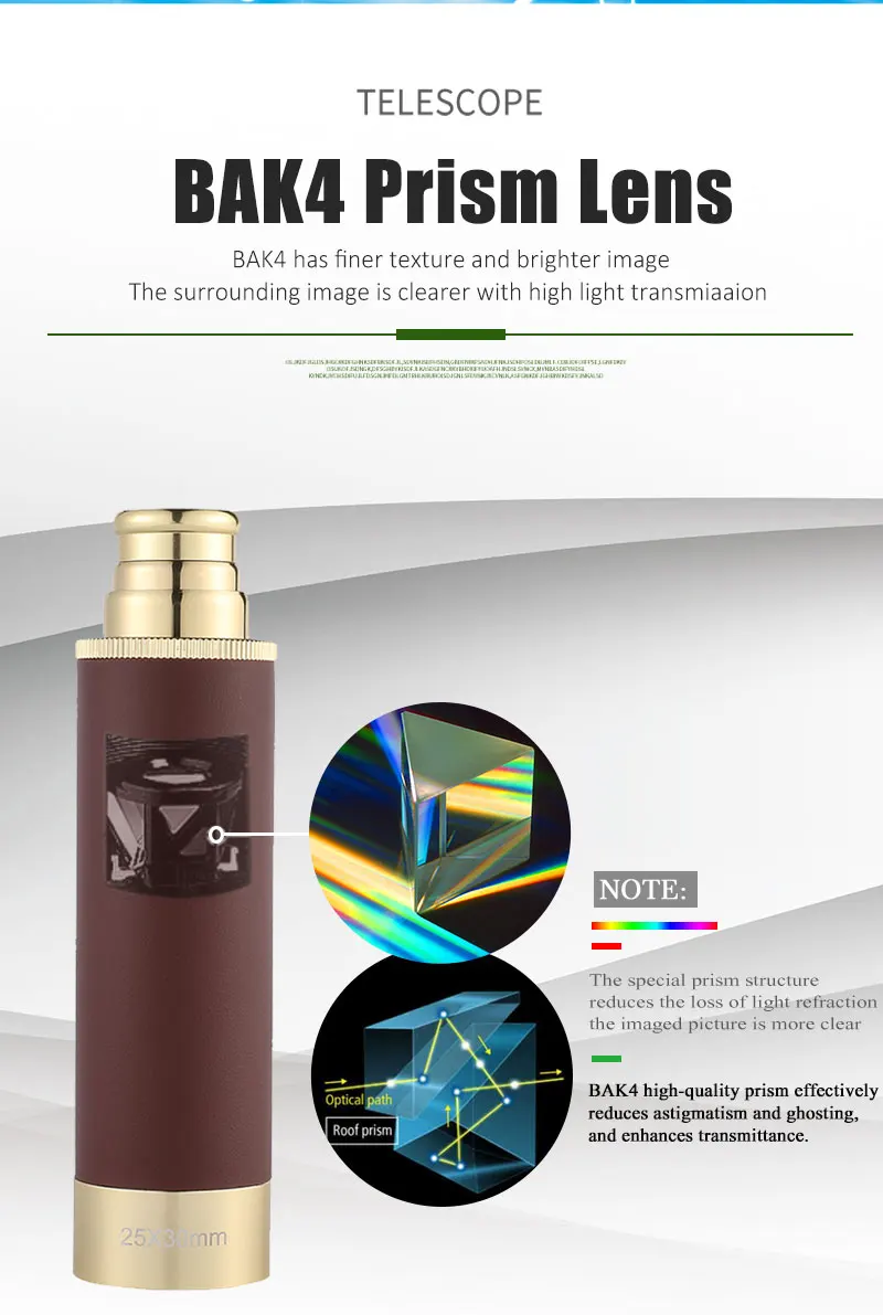 Основная часть корпуса зеркала-авиационный алюминий. Захватная часть завернута в высококачественную кожу. Внешний вид элегантный, а рукоятка имеет толстое ощущение металла на руке. В линзе используется Призма Paul BAK4, четкое зрение, открытое и яркое! Он очень компактный! Легко носить с собой! 1: размер и вес очень маленькие и удобные для переноски 2:508 Оригинальная продукция HD от производителя, очень тонкая работа 3: чистое Оптическое стекло, синяя пленка с полным покрытием поверхности, хороший эффект изображения 4: аксессуары: портативная тканевая сумка (дополнительная сумка), зеркальная ткань, инструкции и т. д.