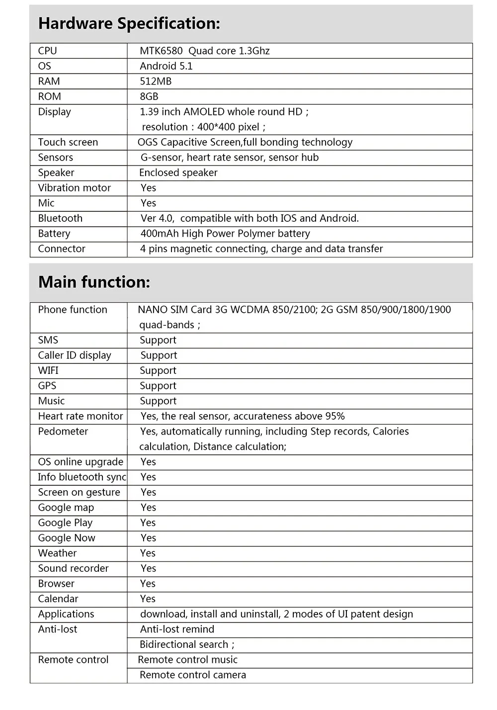Модель: умные часы Interpad KW98 Процессор: 1,3G четырехъядерный, MTK6580 Операционная система: ОС Android 5,1 Память: 512 Мб RAM/8 Гб ROM Частотный диапазон: 3G WCDMA 850/2100 или по индивидуальному заказу; 2G GSM 850/900/1800/1900 quad-bands Sim-карта: Поддержка Nano sim-карты Сенсорный экран Экран: 1,4 дюймов AMOLED круглый HD Разрешение: 400*400 пикселей; 260000 цветов WIFI/GPS/Google Play: Поддержка Версия Bluetooth: BT 4,0 Емкость аккумулятора: 350 мАч