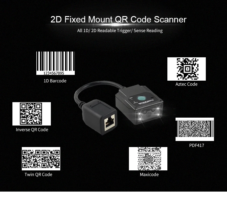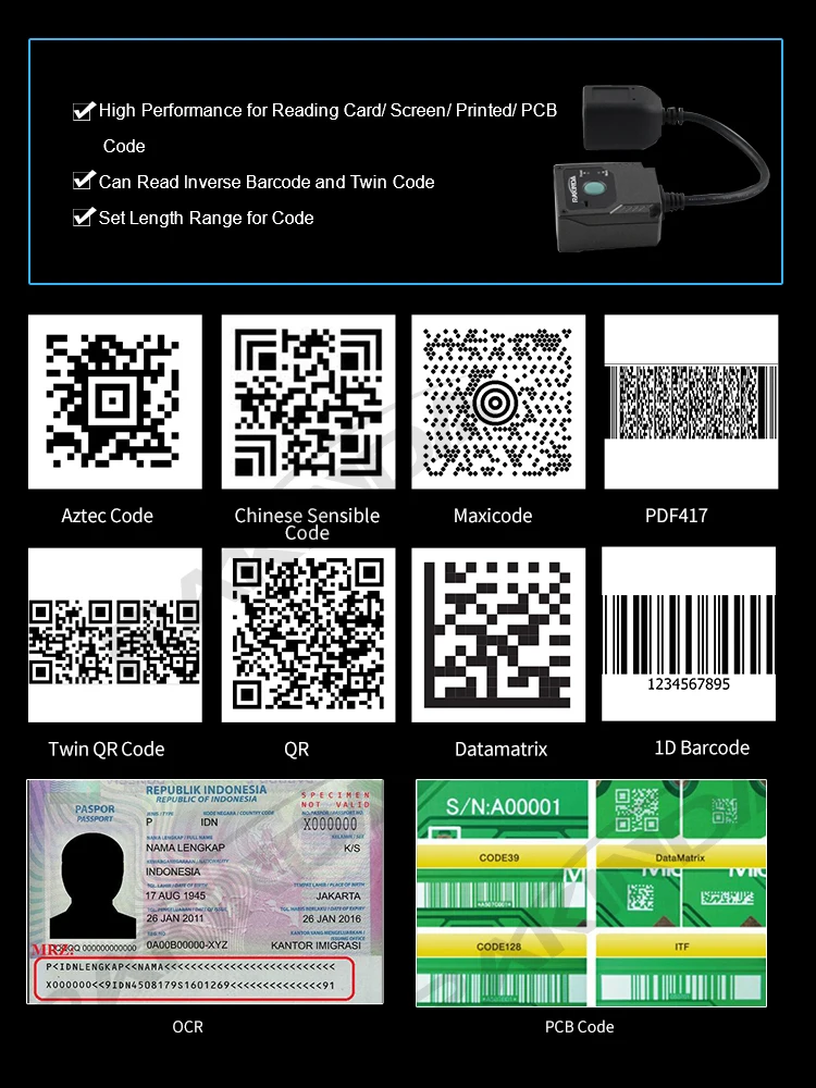 2D: PDF417, матрица данных, qr-код, Aztec, CSC, Maxicode, Mircro QR, Micro PDF417, GM, Code One и т. д.