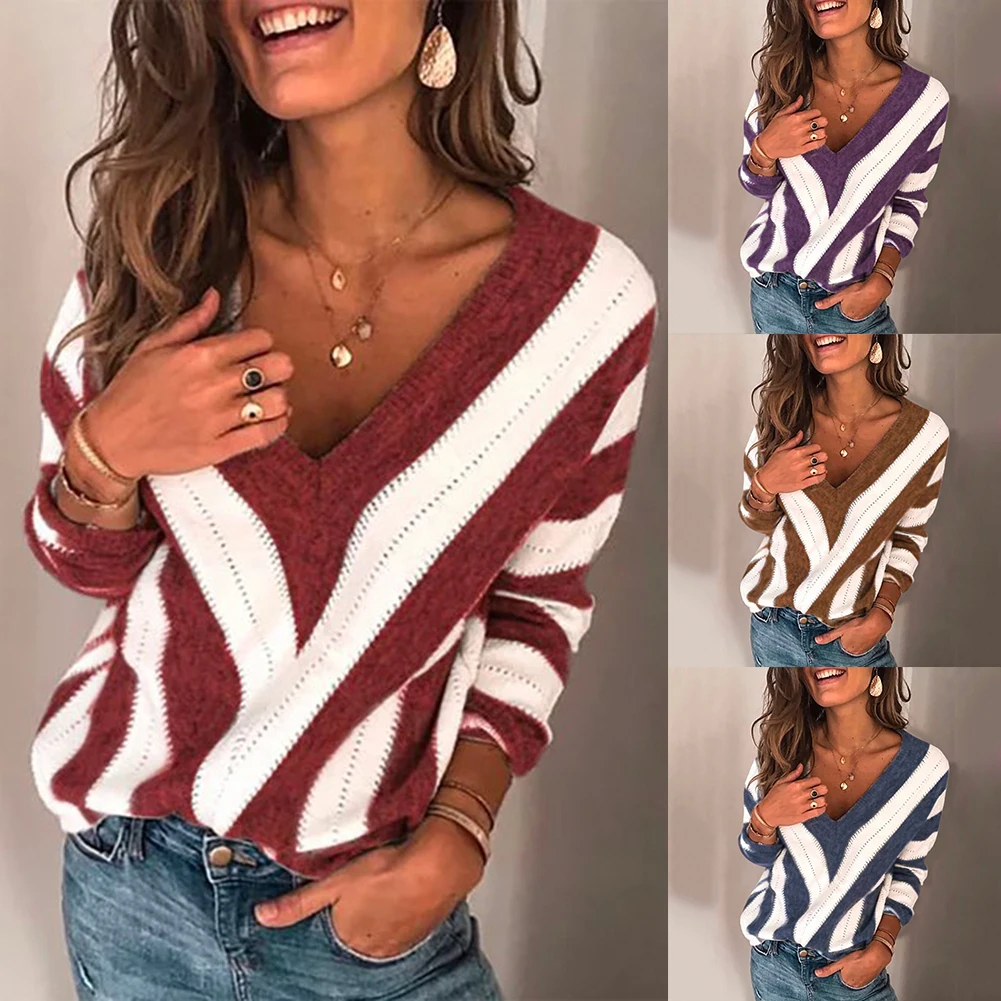 Женский свитер в полоску с глубоким v-образным вырезом, повседневный трикотажный джемпер с длинными рукавами на осень и зиму, 5XL