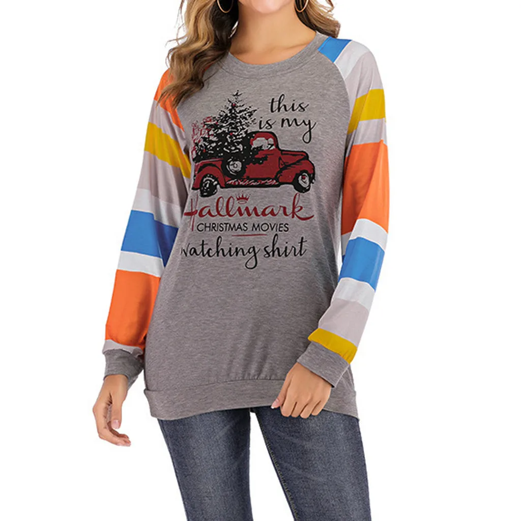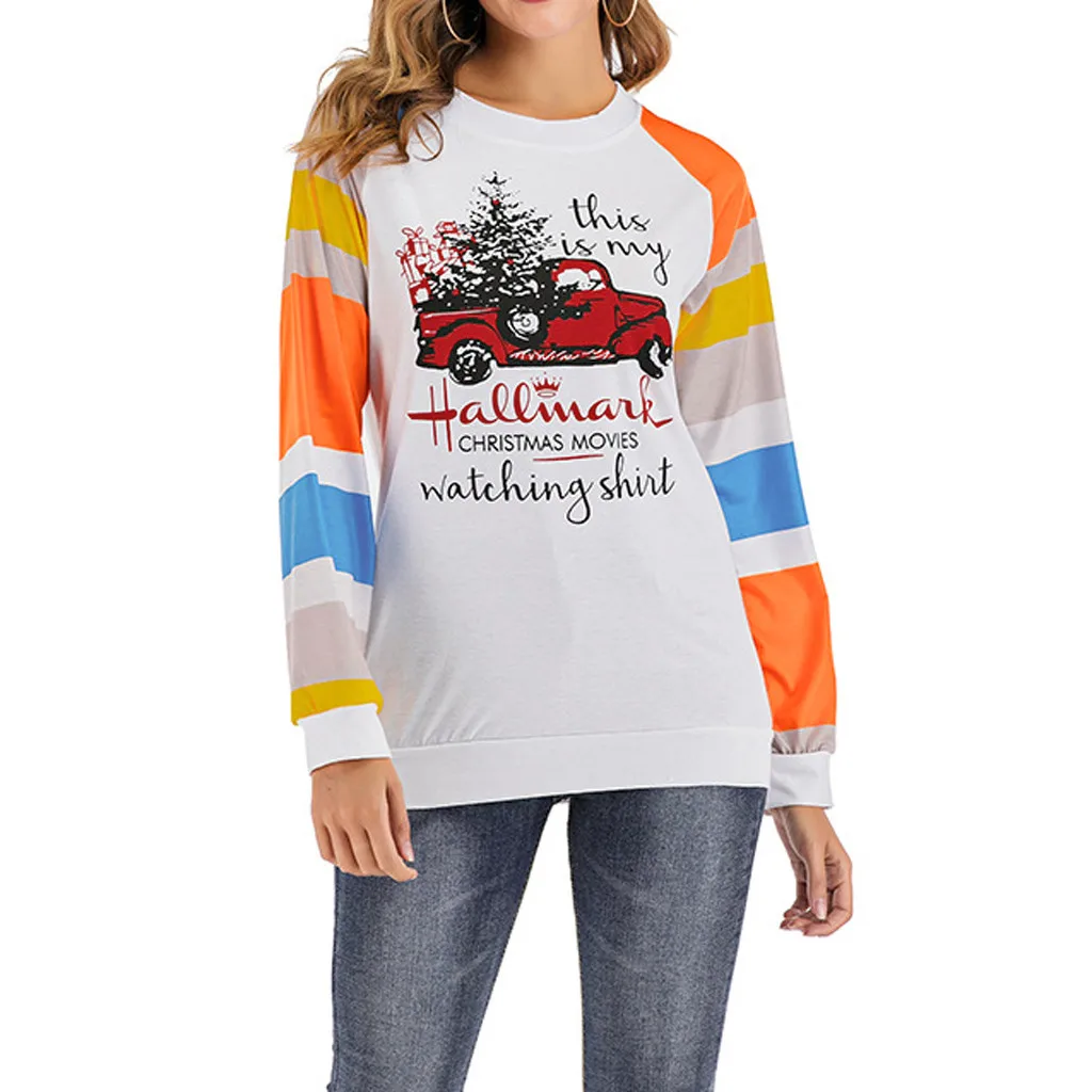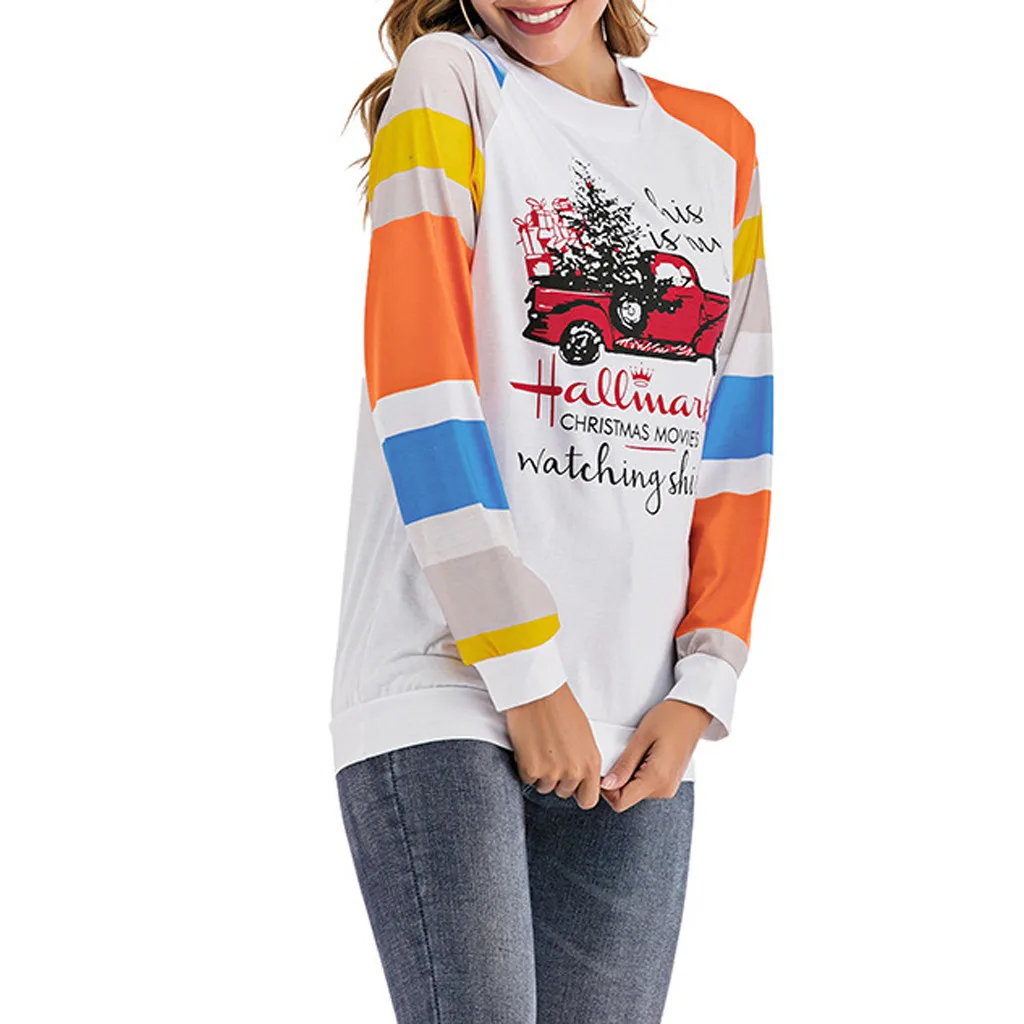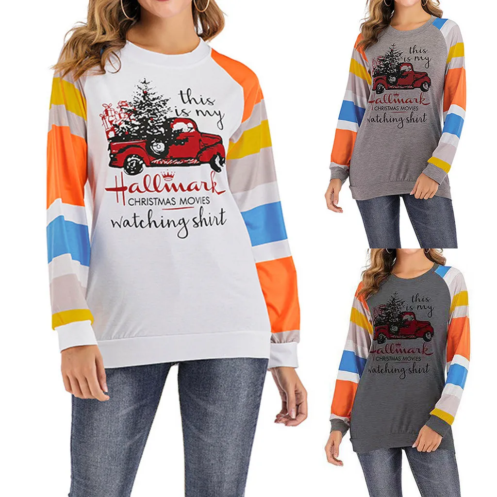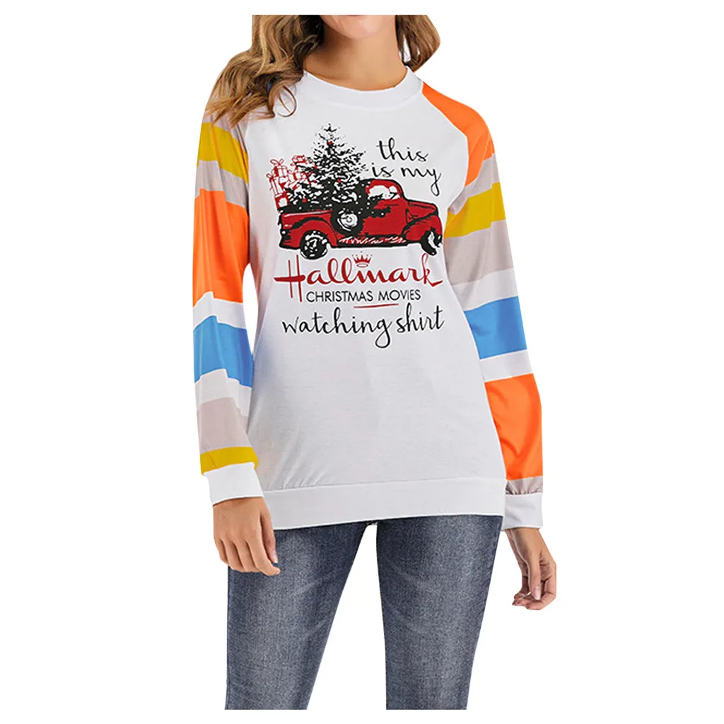 Женские топы с длинными рукавами и круглым воротником с принтом машинки рождественской елки и буквами