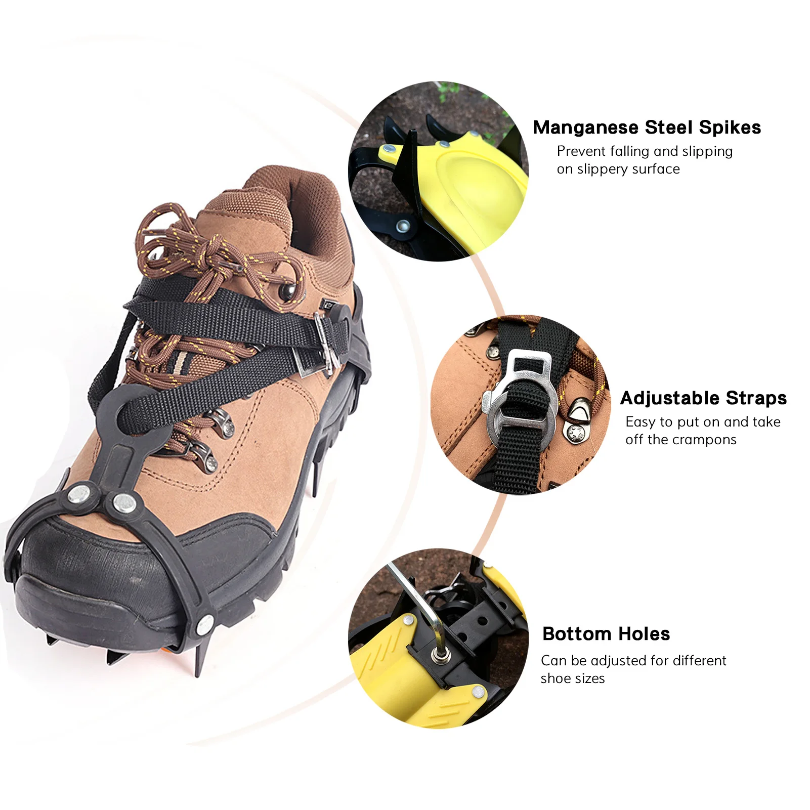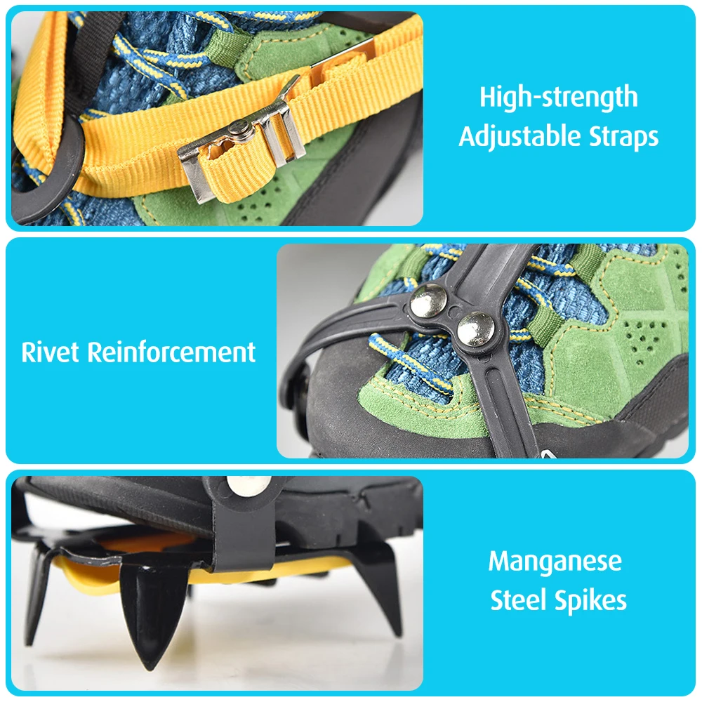 Ледяные Шипы снижают риск травмирования от скольжения и падения при ходьбе по льду, снегу, грязи и влажной траве или другим плохим условиям. Идеально подходит для прогулок, альпинизма, пеших прогулок, подледной рыбалки, кемпинга и т. д.