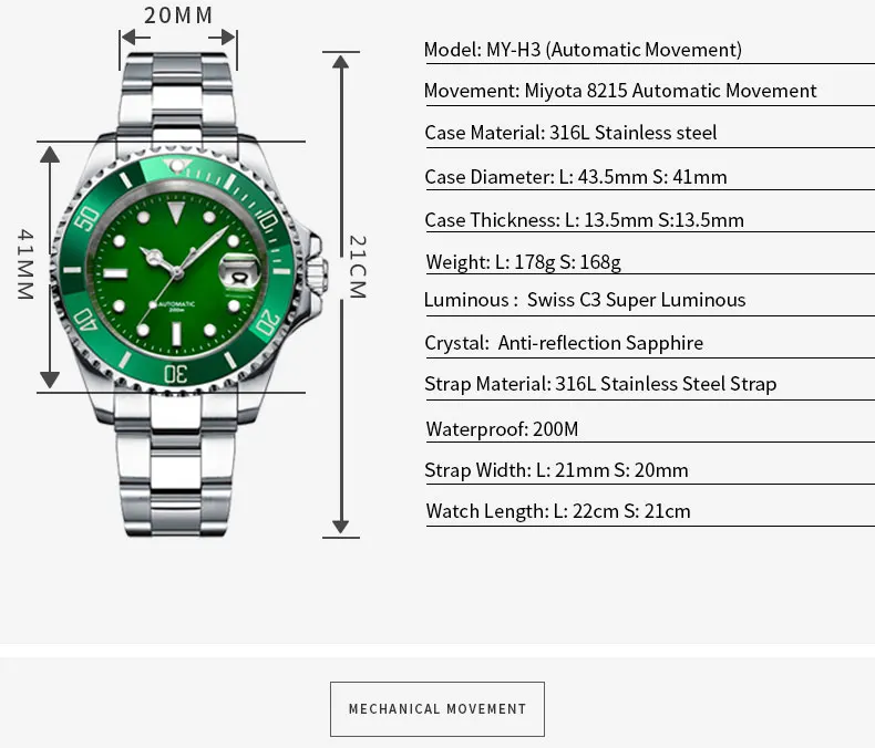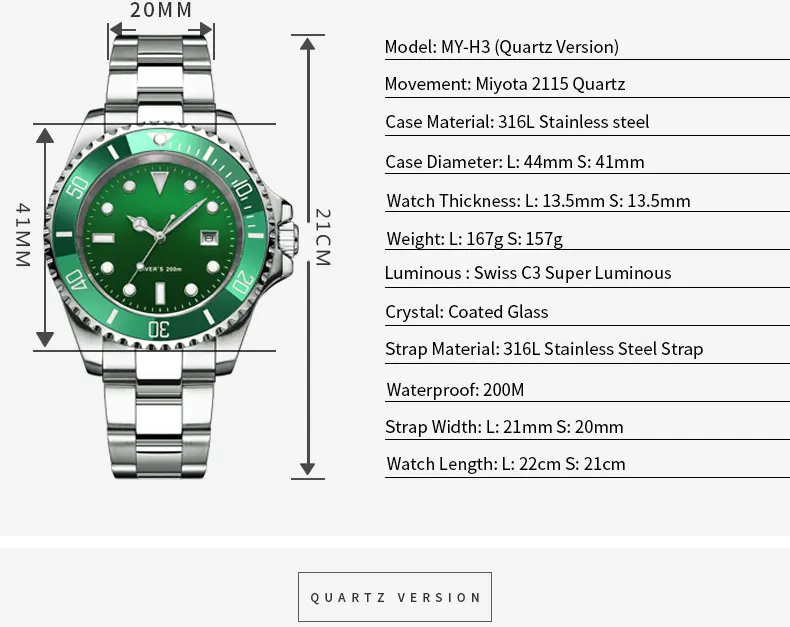 Механическая модель MY-H3 (большой размер): Особенности: прочный ремешок из нержавеющей стали 316L, двойная страховочная Складная пряжка, SD1986-AC механические механизм Japan Miyota 8215. 316L чехол из нержавеющей стали, нижняя крышка, барная головка Двойной водонепроницаемый головки винта Swiss C3 Супер светящийся буквенный, Swiss C3 Супер светящийся цветок указатель, (100% Swiss C3 Супер светящийся, 240000/кг светящийся порошок) Japan Miyota 8215 автоматический механический механизм (40 часов хранения энергии) 316L ремешок из нержавеющей стали/кожаный ремешок (DW с таким же маслом)/силиконовый ремешок Диаметр циферблата 41 мм, толщина циферблата 13,5 мм, положение ушей ремешка 20 мм Вес нетто: 92 г (включая кожаный ремешок) Нет логотипа буквенный 12 часов пустой, нижняя крышка пустая. Кварцевый MY-H3 (маленький): SD1986-QZ японский кварцевый механизм Miyota Особенности: 316L чехол из нержавеющей стали, нижняя крышка, барная головка Двойной водонепроницаемый головки винта Swiss C3 Супер светящийся буквенный, Swiss C3 Супер светящийся цветок указатель, (100% Swiss C3 Супер светящийся, 240000/кг светящийся порошок) Японский кварцевый механизм Miyota 2115 и оригинальный аккумулятор (срок службы батареи 4 года) 316L ремешок из нержавеющей стали/кожаный ремешок (DW с таким же маслом)/силиконовый ремешок Диаметр циферблата 41 мм, толщина циферблата 13,5 мм, положение ушей ремешка 20 мм Вес нетто: 92 г (включая кожаный ремешок) Нет логотипа буквенный 12 часов пустой, нижняя крышка пустая.