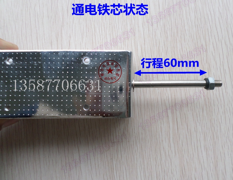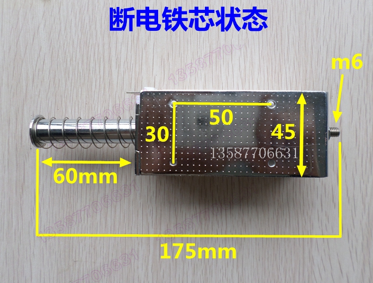 [product name]: push-pull electromagnet long stroke [Specification model]: Thrust 15KG self-reset [Installation size]: 30x50 (mm) [Push-pull stroke]: Customized 60mm (mm) [Working voltage]: DC12V / DC24V / DC110V / DC220V / AC220V [conventional voltage]: AC220V other voltage shot, please leave a message [Working principle]: The energized iron core pushes the load, and the power is turned off by the spring (please note that the spring is soft and can only reset the iron core). Such electromagnets work by impact force. The inertial impact force is huge. 12v 24v requires a large current, 12V requires 10A, 24V requires 8A. Customers who are not suitable for power supply must pay attention. Please pay attention to the customer because the travel is too long and the current is too small. May not be able to drive. Basically, a current of about 5A is required. [Note]: Actuator as an automation device. Because the current is large, the single cycle cannot be energized for a long time, which is suitable for point-type work. A single power-on working time is within 2 seconds! Ultra-long power-on is similar to a manual short-circuit coil, which causes the temperature of the electromagnet to rise sharply. If the temperature is too high, it will affect the life of the electromagnet.