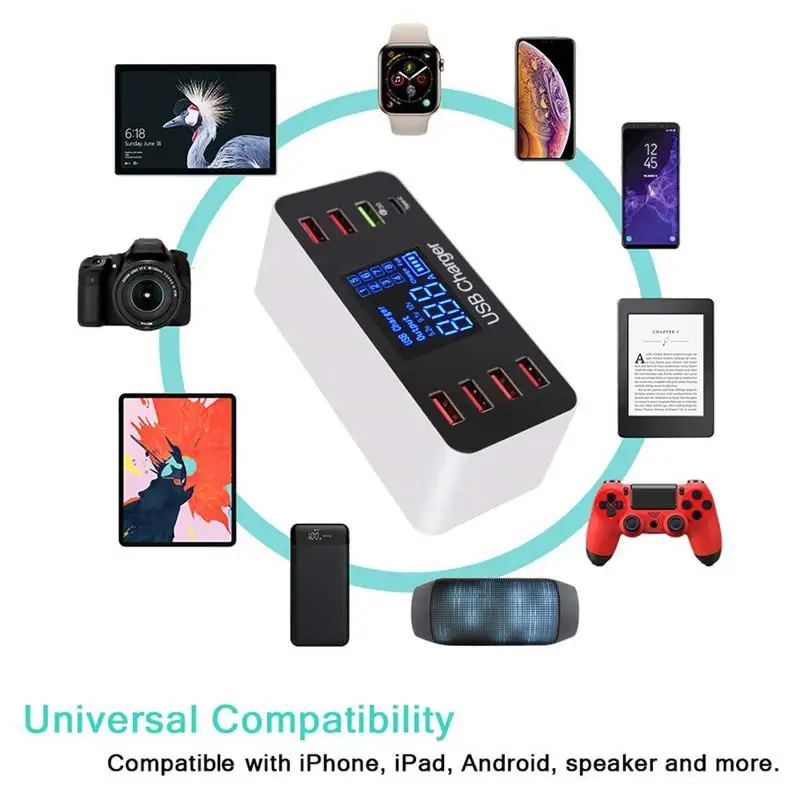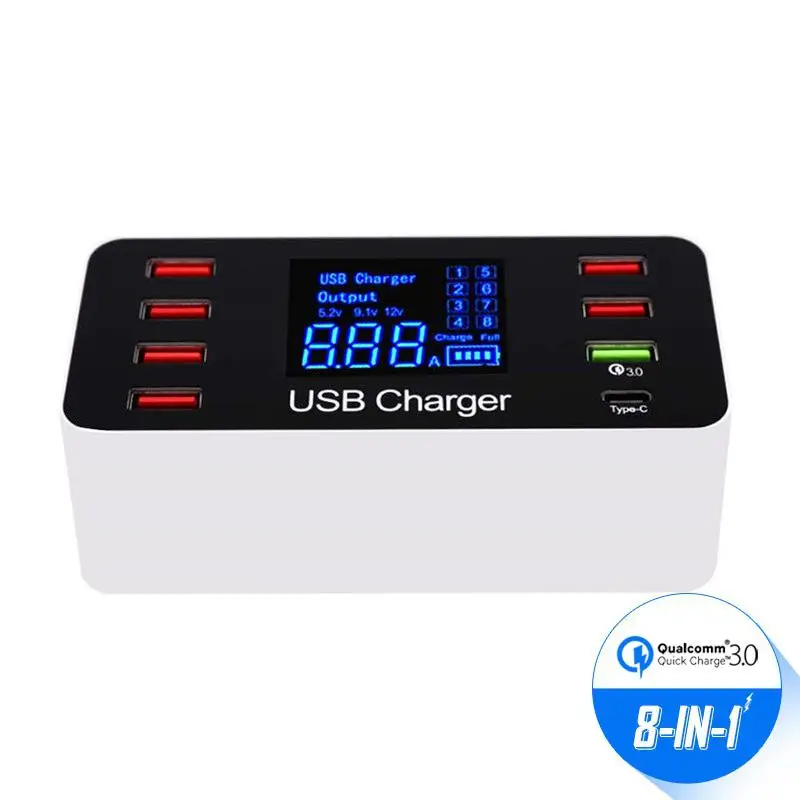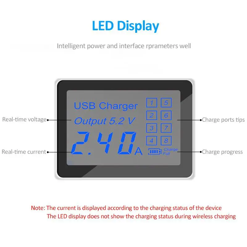 Уникальный светодиодный дисплей поможет вам контролировать ток зарядки, напряжение и состояние батареи в режиме реального времени. 8 портов USB имеют название от 1 до 8, если вы используете порт 1, экран будет включать светильник с мигающим номером 1, а другие будут темными, если вы их не используете.