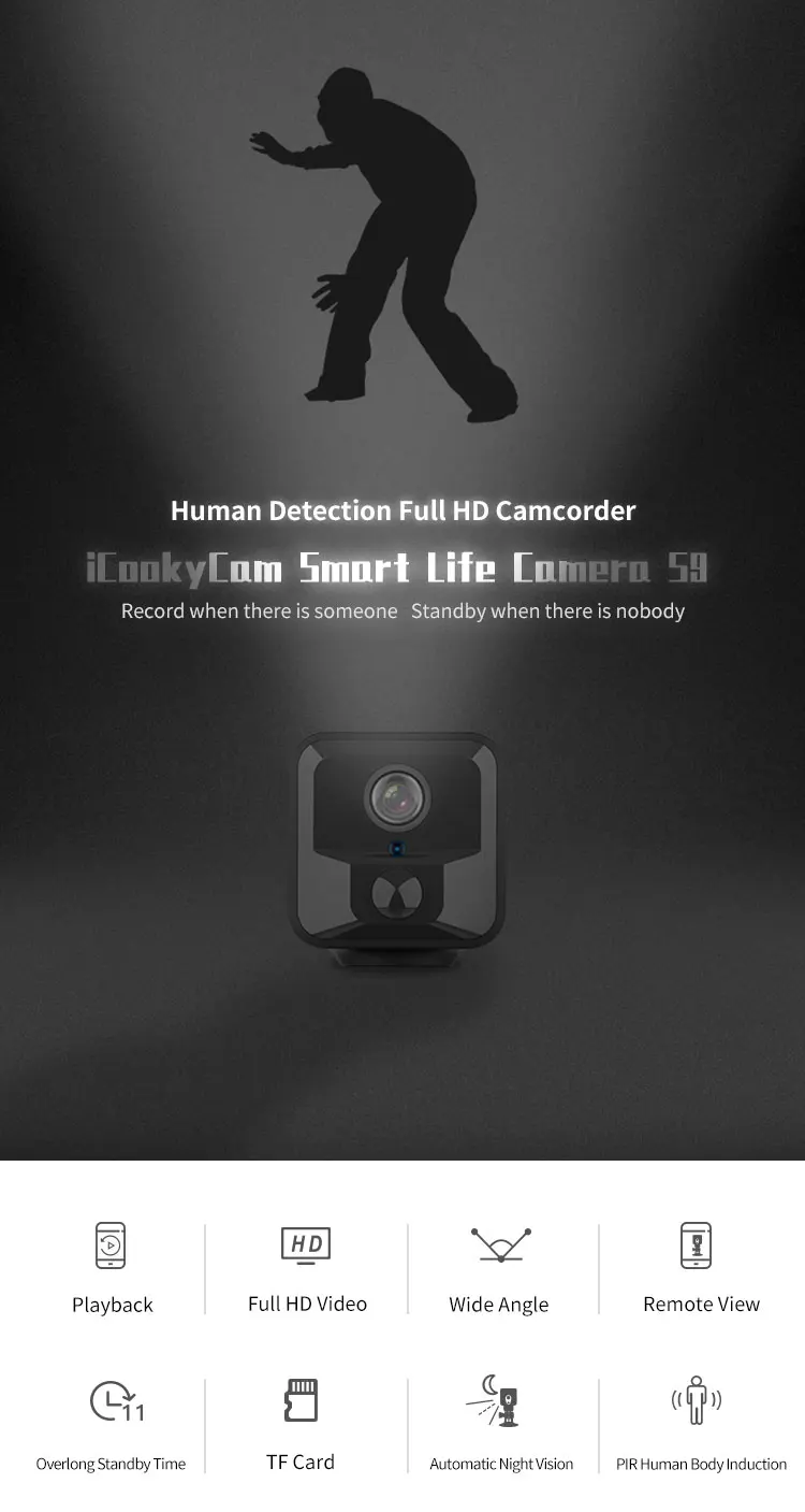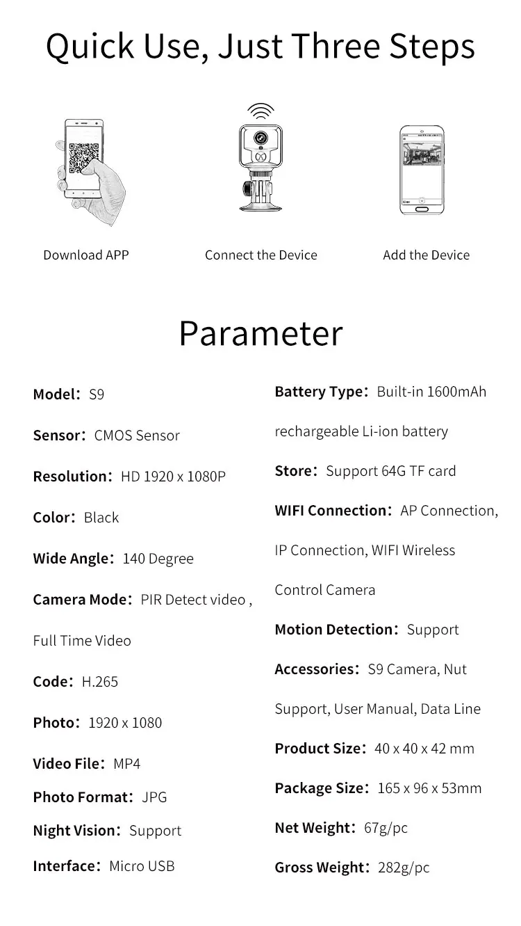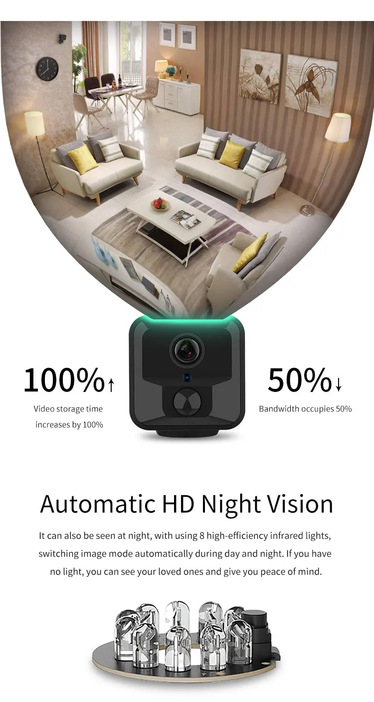 Характеристики: * компактный, удобный в переноске, функциональный и простой в использовании. * HD 1080P Разрешение, H.265 Эффективное сжатие видео. * Умное PIR человеческое зондирование, запись при обнаружении человеческого тела, не обнаружено никаких записей. * 8 инфракрасный светодиодный свет, ночной эффект более четкий. * Светочувствительный индукционный контроль автоматически открывается и закрывает ИК. * Соединение AP и IP. * Кронштейн гайки установлен и оснащен мощным магнитным диском. Он стабильный и надежный. * Встроенный 1600 мА/ч, большая емкость аккумулятора. * Покрытие видео цикла, максимальная поддержка tf-карты 64G.
