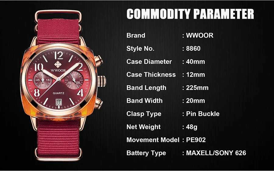 Стиль: модная повседневная футболка Механизм: оригинальный японский кварцевый механизм Seiko PE902 Батарея: японская импортированная батарея Главные особенности: -2019 новые продукты с этикетками и высоким качеством; Функция отображения календаря; -Водонепроницаемость 3 АТМ/30 м (поддерживает плавание в бассейне и душ в холодной воде); Классические часы 5 цветов: черный/розовый/красный/синий/зеленый; -Пластик чехол; Нейлоновый ремень; -Горячая Распродажа классических женских подарочных часов; Характеристики (Приблизительные): -Чехол диаметр: 40,0 мм -Чехол Толщина: 12,0 мм -Полоса пропускания: 20 мм -Общая длина: 225 мм -Вес изделия: 48 г Посылка включает в себя: -1 x WWOR/женские часы -1 подарочная коробка WWOOR -Руководство пользователя WWOOR-1 шт. -1 x чистая ткань Купите больше штук и наслаждайтесь скидками