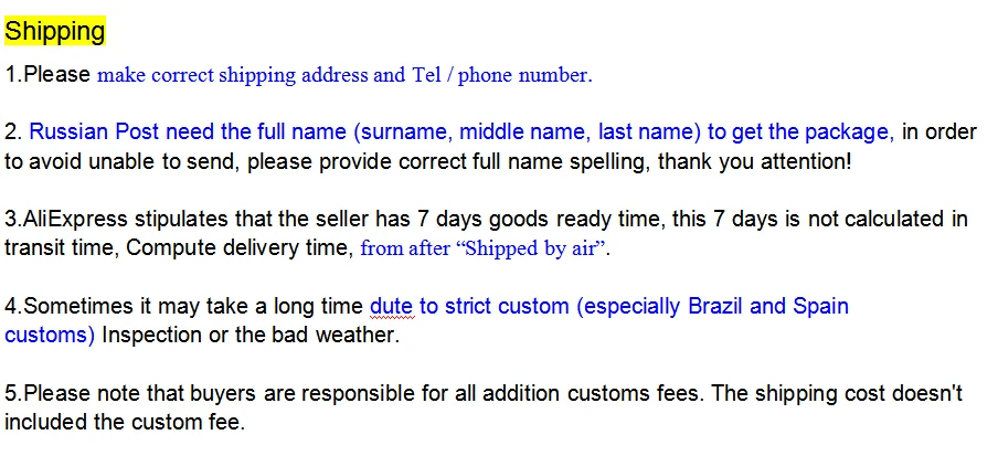 Если вы хотитеЧтобы получить вашу посылкаБыстрее,И хочуОтслеживаниеИнформация о посылка,Пожалуйста, выберите «epacket»Или"Авиа-отправление Почты Китая", "Epacket" Срок поставки: 10-28Дней.