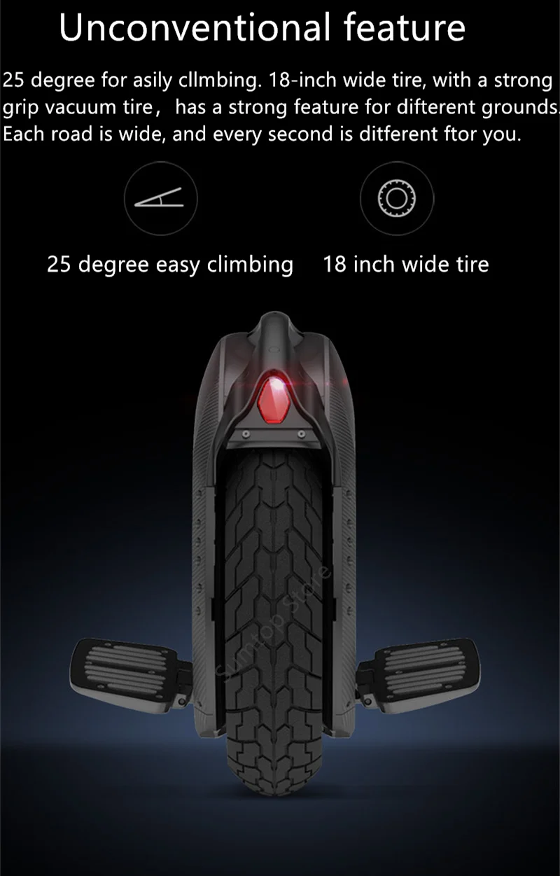 25 градусов легкий подъем. 18 дюймов широкая шина, с сильным захватом вакуумной шины, имеет сильную особенность для различных участков. Каждая дорога широкая, и каждая секунда отличается для вас.