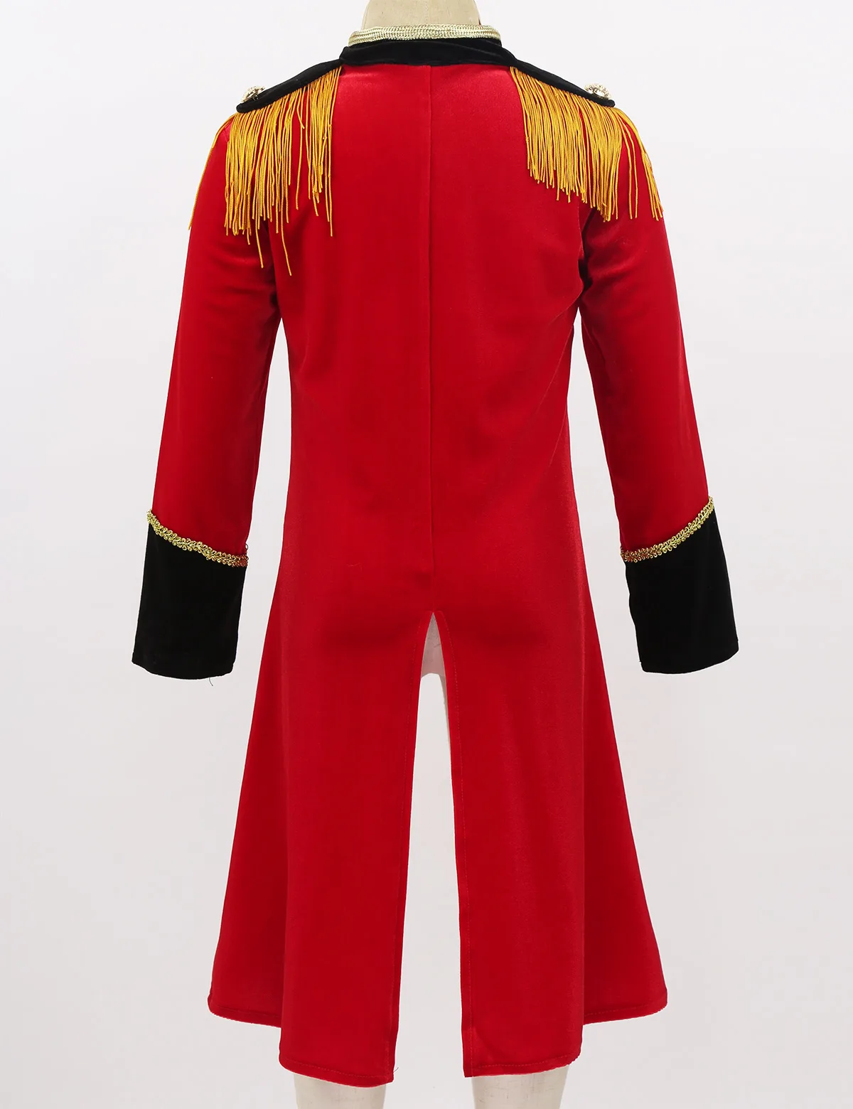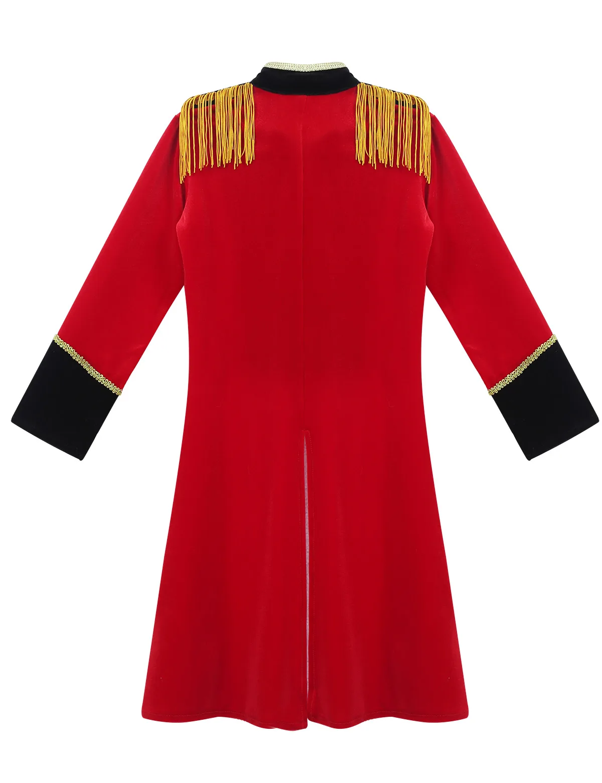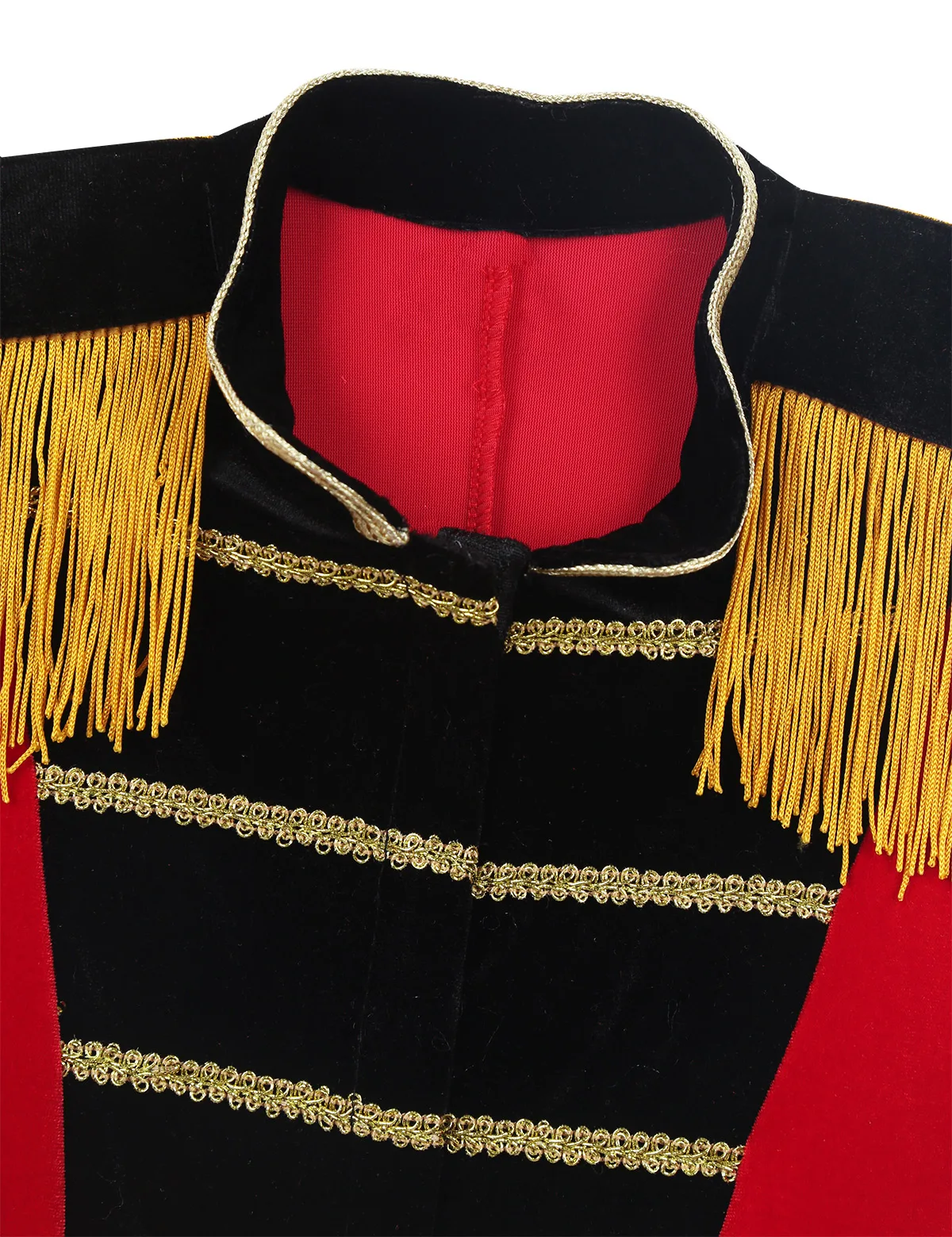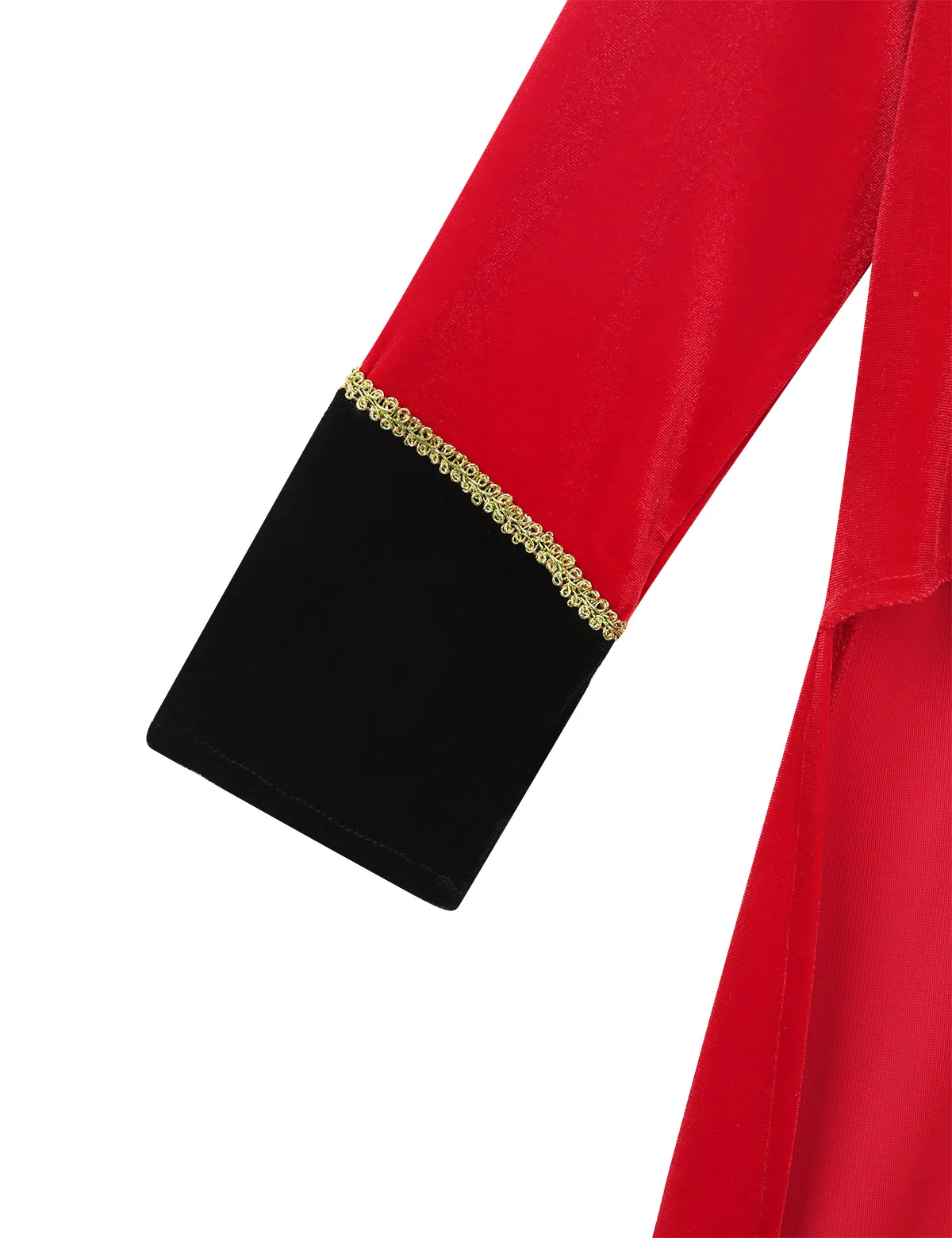 Длинные рукава, плечи с кисточками, воротник-стойка. Спереди с золотой оплеткой, застежка на липучке.