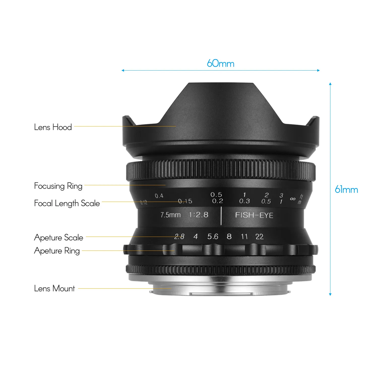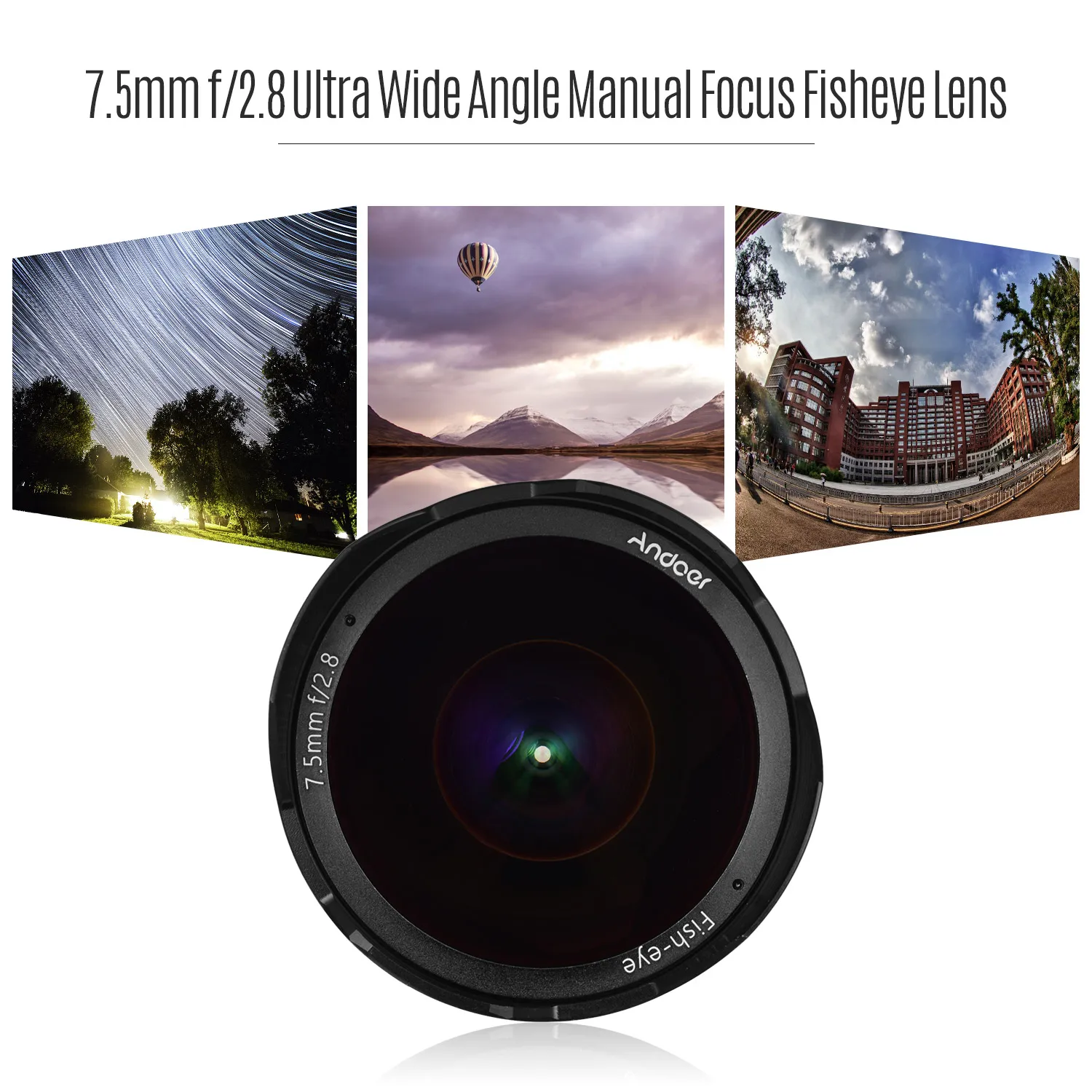 7,5 мм фокусное расстояние и 180 ° ультра широкий угол поля, подходит для съемки пейзажей, видеокамера для панорамной съемки, путешествия, подводной съемки и т. д.