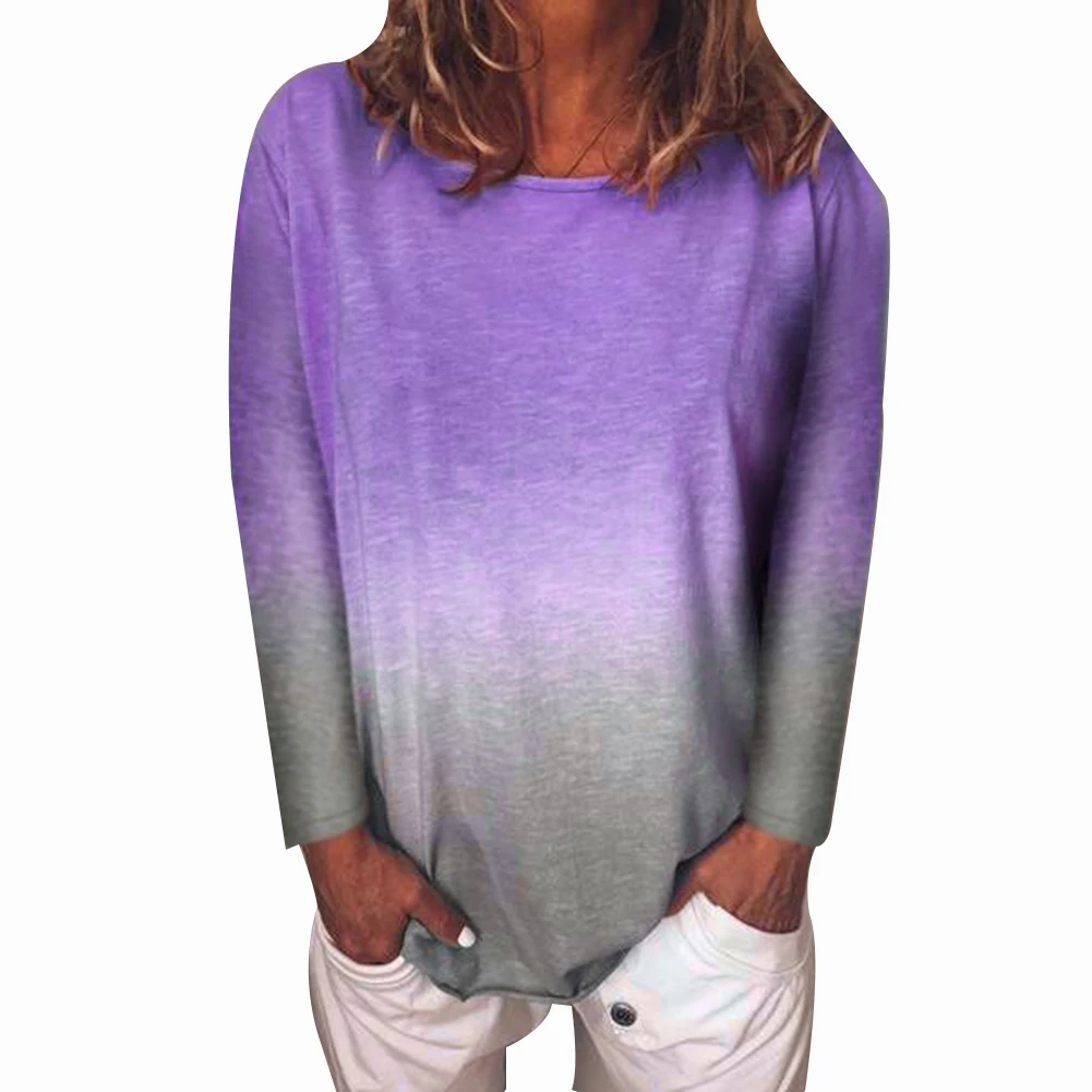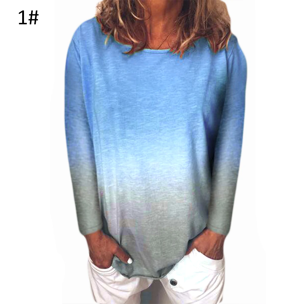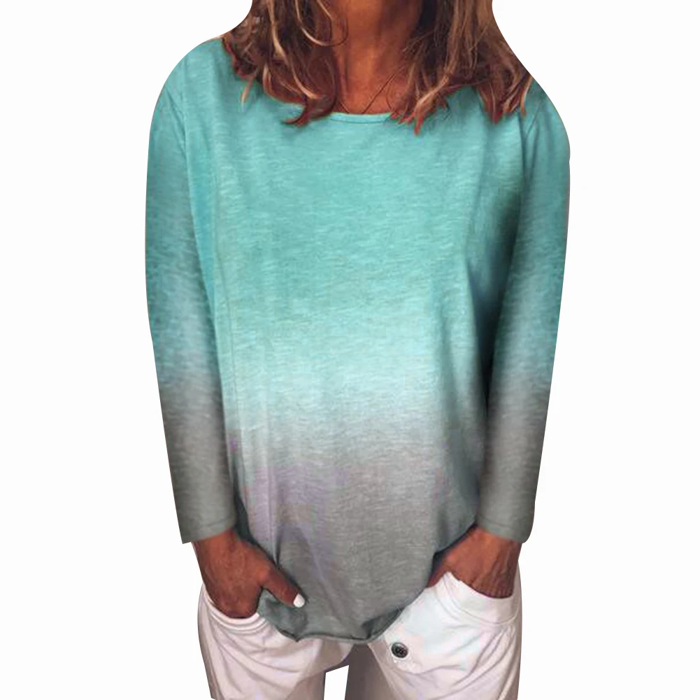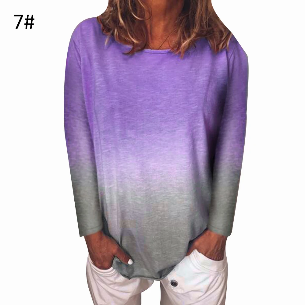 Модная женская Повседневная футболка с длинными рукавами и радужным градиентом, футболка с круглым вырезом, Топ
