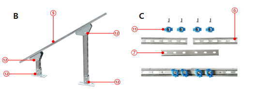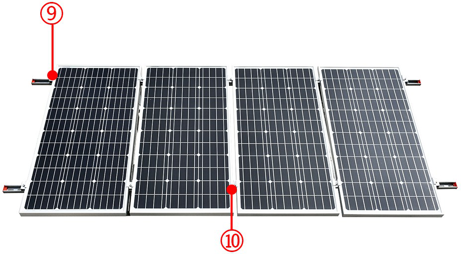 Ⅶ. Закрепите солнечные панели в рамке на рисунке е с помощью аксессуаров ⑨ и ⑩ соответственно, как показано на рисунке E.