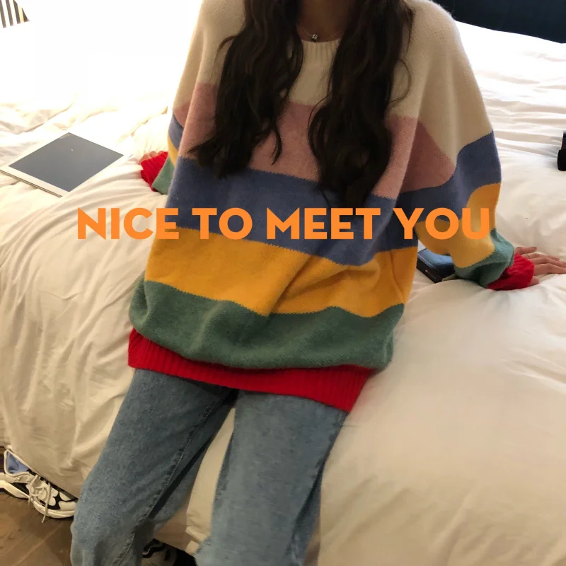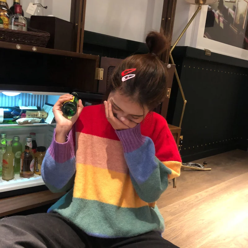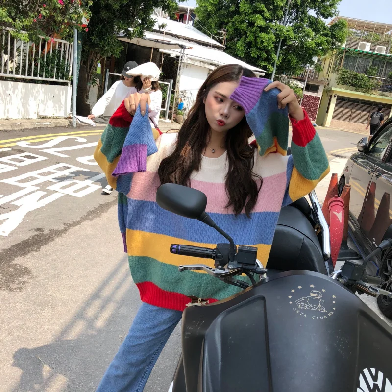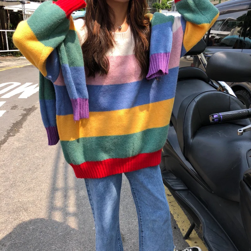 Свитер женский в радужную полоску, Осенний джемпер в стиле Харадзюку, винтажные пуловеры, Свитер оверсайз, вязаная одежда в Корейском стиле, Свободный теплый цветной V981