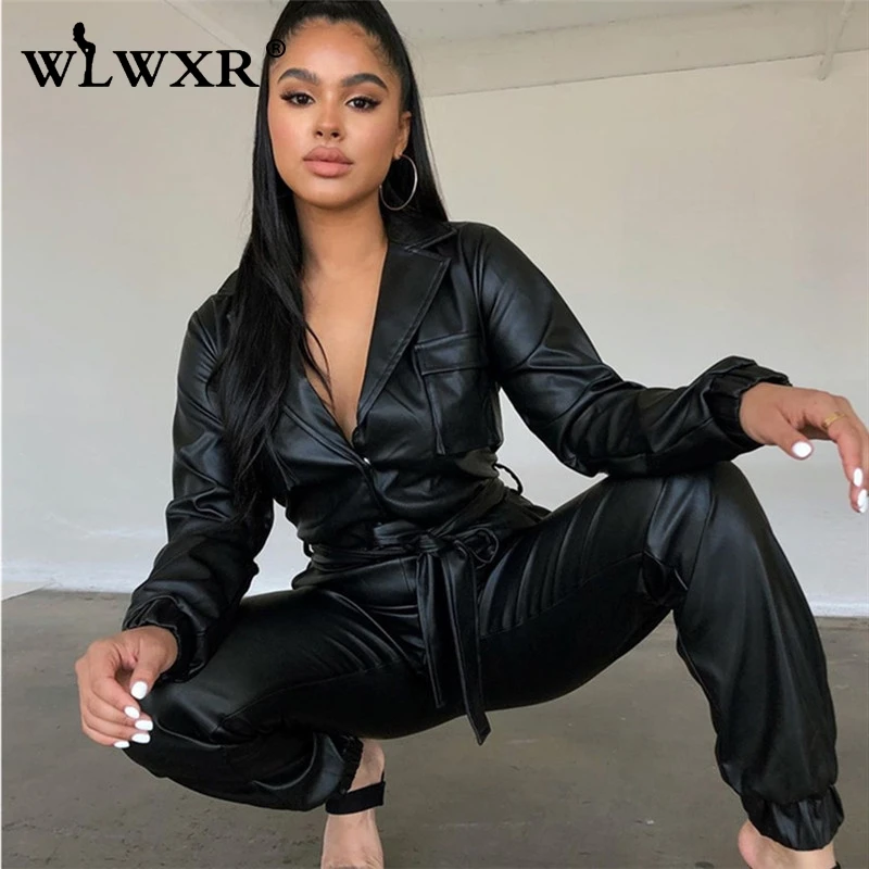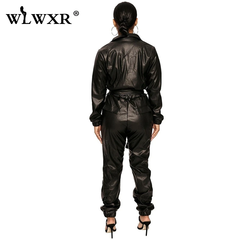 WLWXR осенне-зимний Облегающий комбинезон из искусственной кожи женский комбинезон с длинным рукавом черный обтягивающий сексуальный комбинезон длинный женский комбинезон