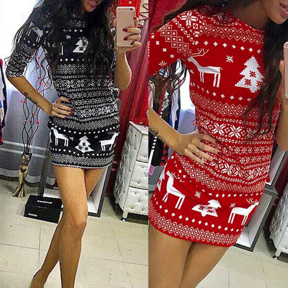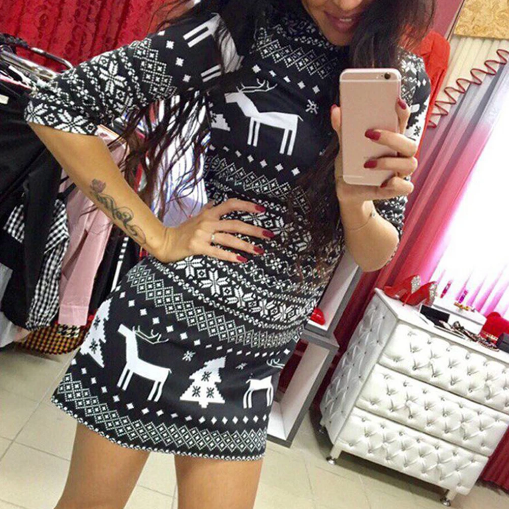 Рождественская мода женщин Лось дерево печати О образным вырезом Половина рукава Bodycon Вечерние платья