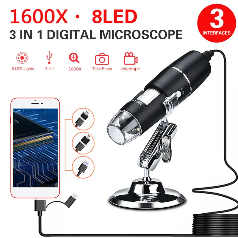 Цвет: черный Материал: АБС-пластик Размер: диаметр 3 см Длина: 12 см Длина линии Usb: 1,4 м Интерфейс: USB, TYP-c, micro Пиксель: 300000 Сенсор: КМОП-матрица Лучшее разрешение видео: 640*480 Увеличение: 50-1600X Лампа LDE: 8LED Поддержка съемки изображений: Формат изображения: JPEG Поддержка записи видео: Формат видео: MP4 Система поддержки: widows/Mac Сертификация качества: CE/FCC/RoHS Язык поддержки программного обеспечения: китайский и английский