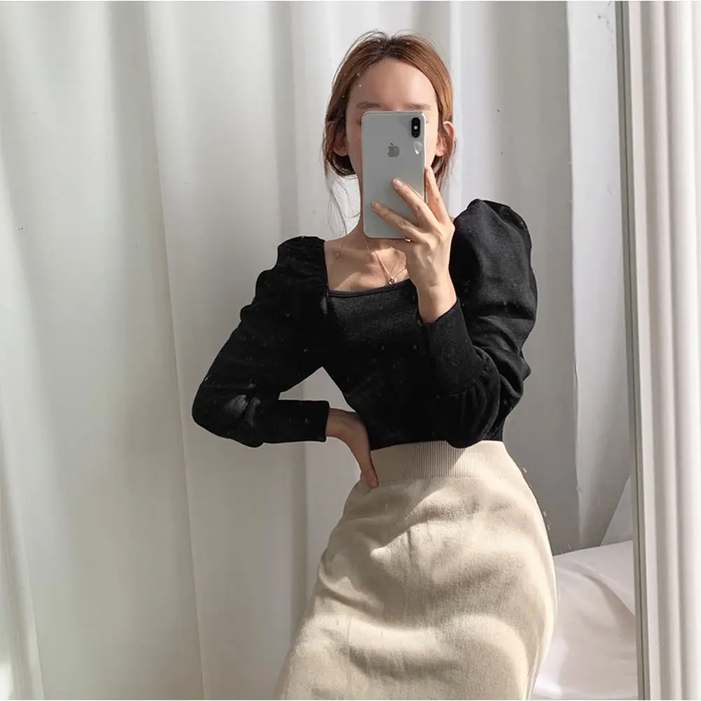 Женский однотонный пуловер Woherb, черный пуловер с высоким воротником и длинными рукавами-фонариками, тонкий свитер в стиле пэчворк на осень