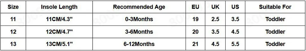 Размер Стельки Длина Рекомендуемый возраст ЕС Великобритания Свяжитесь с нами Подходит для 11 11 см/4,3" От 0 до 3 месяцев 19 2,5 3,5 Для детей ясельного возраста 12 12 см/4,7" От 3 до 6 месяцев 20 3,5 4,5 Для детей ясельного возраста 13 13 см/5,1" От 6 до 12 месяцев 21 4,5 5,5 Для детей ясельного возраста