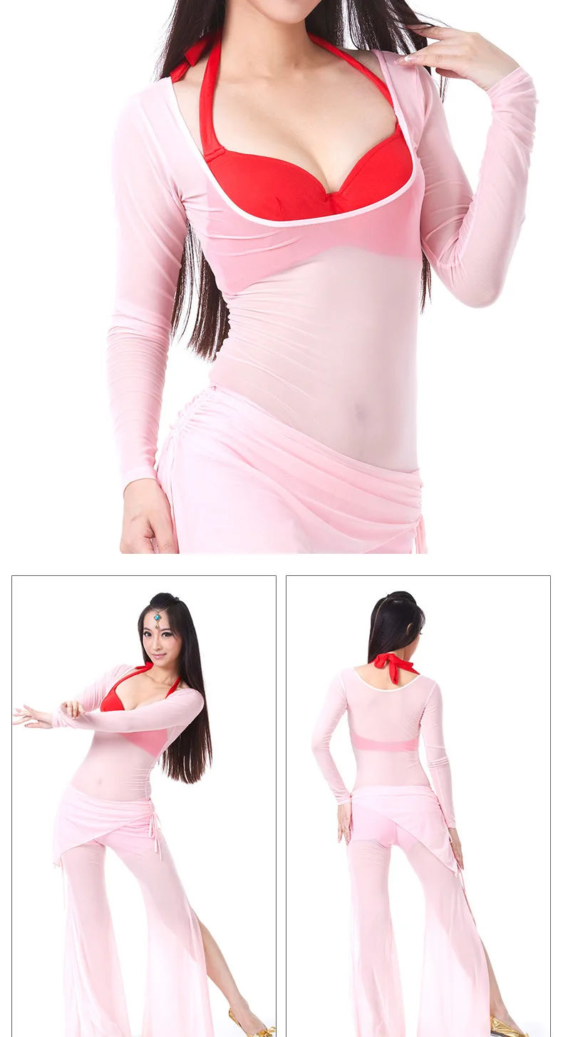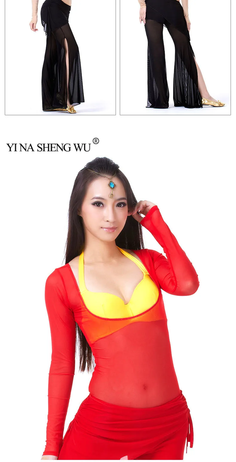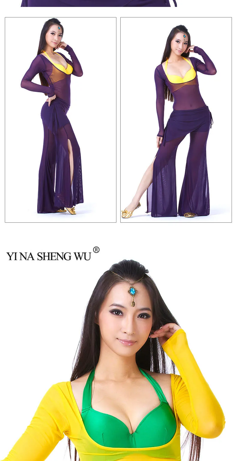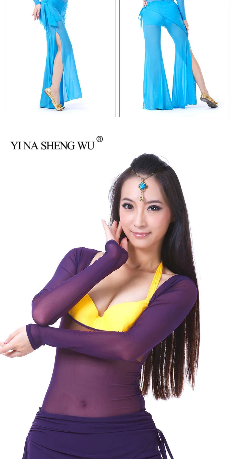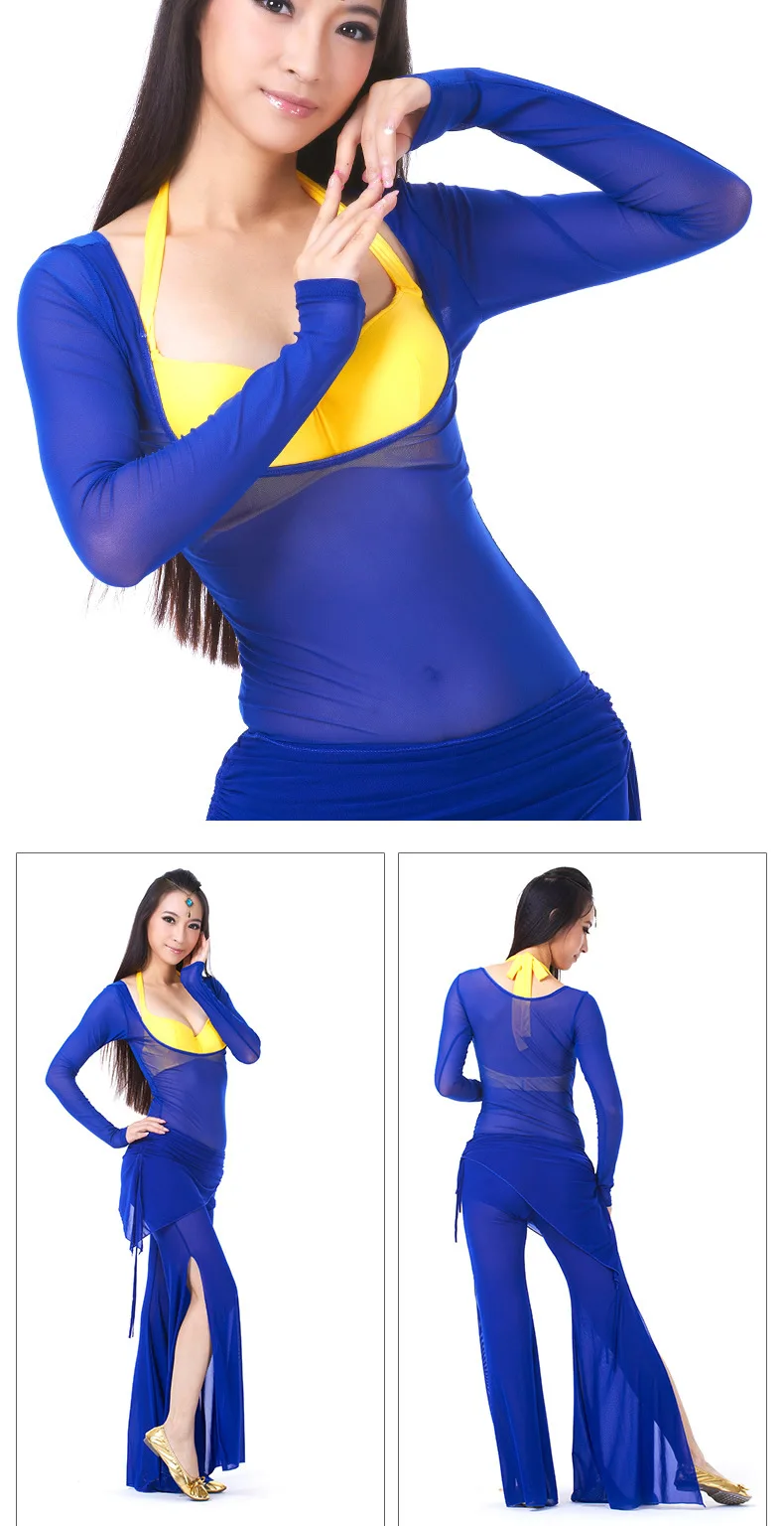 Женский сексуальный костюм для танца живота, сетчатый костюм с длинным рукавом, комплекты для танца живота на осень и зиму, длинные штаны для танцев, с разрезом, 10 цветов