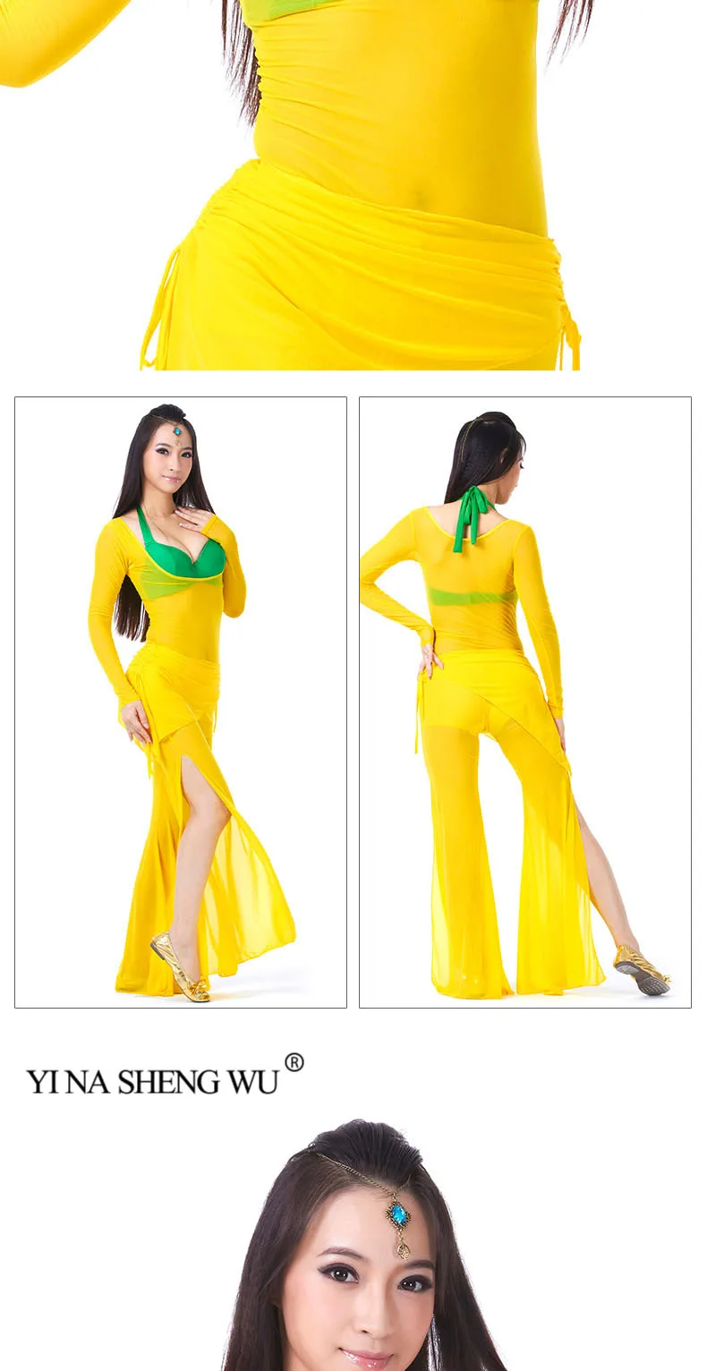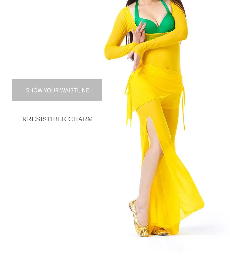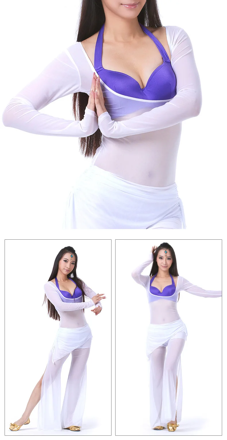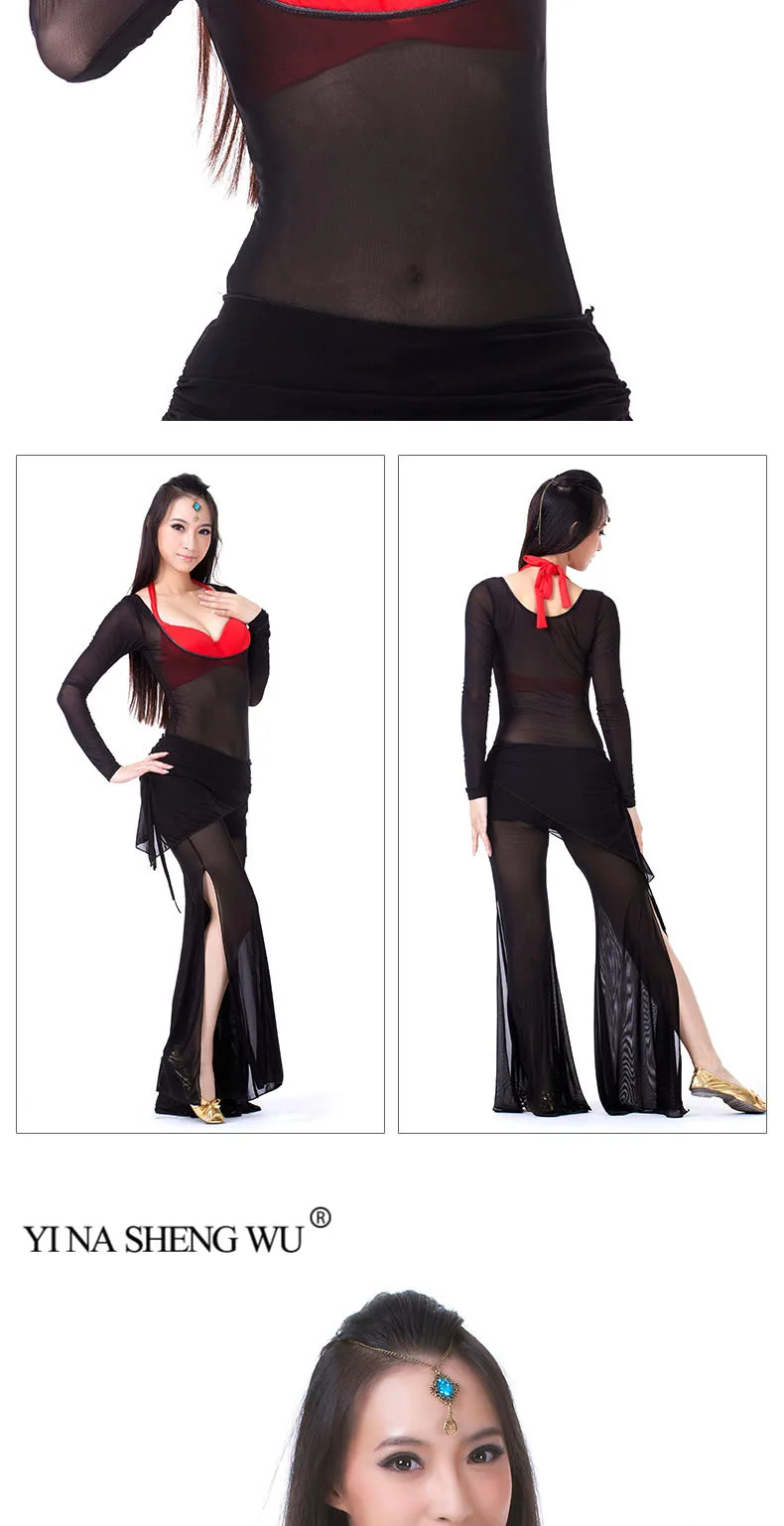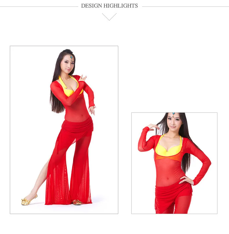 Женский сексуальный костюм для танца живота, сетчатый костюм с длинным рукавом, комплекты для танца живота на осень и зиму, длинные штаны для танцев, с разрезом, 10 цветов