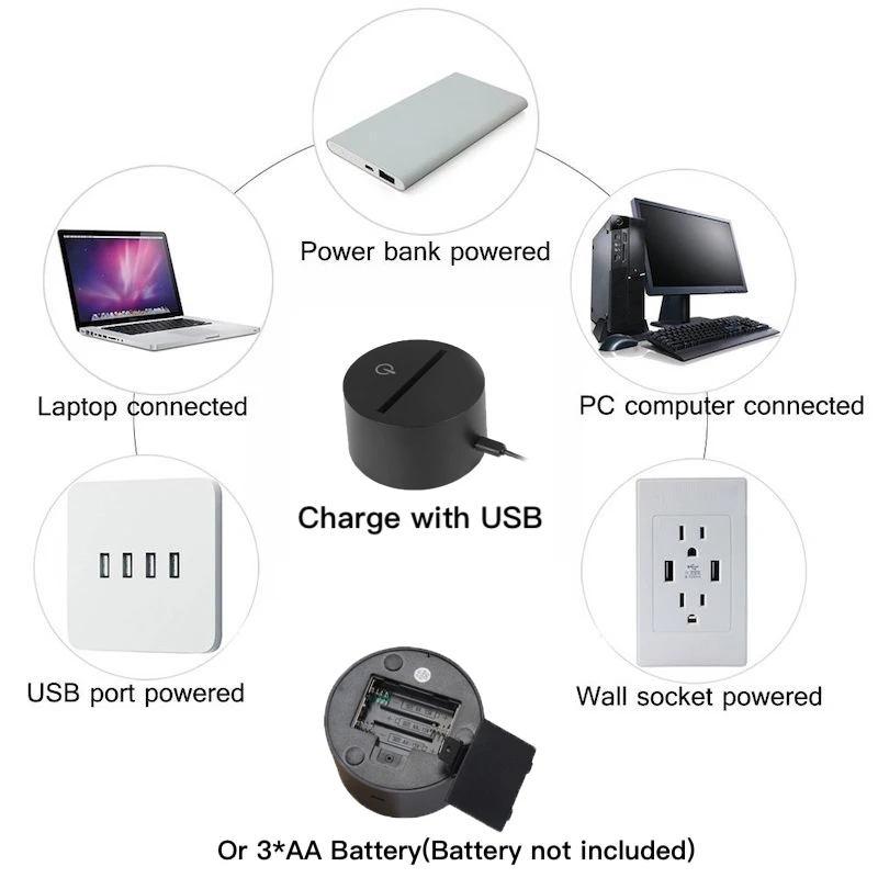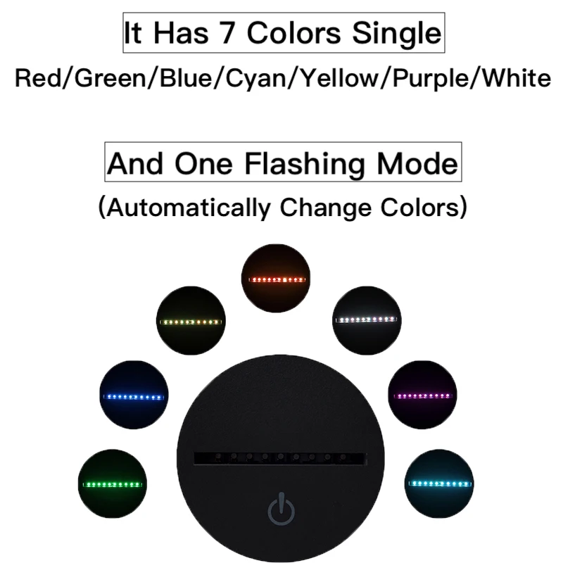 1 акриловая панель 1 кабель питания micro USB 1 x3D светодиодный ночникПодвал Флуоресцентный1. Увеличение яркости 2. Уменьшение яркости 3. Выключение 4. Включение 5. Выбор цвета-статический цвет