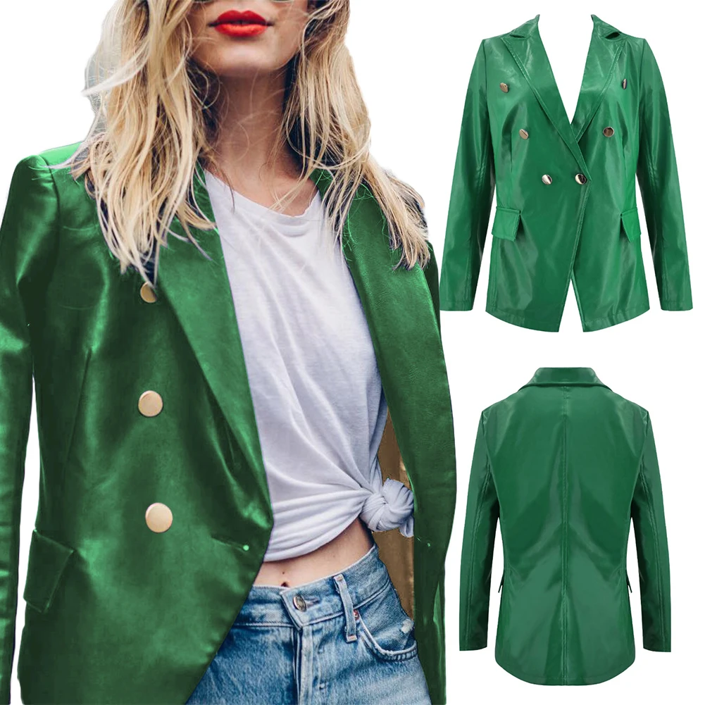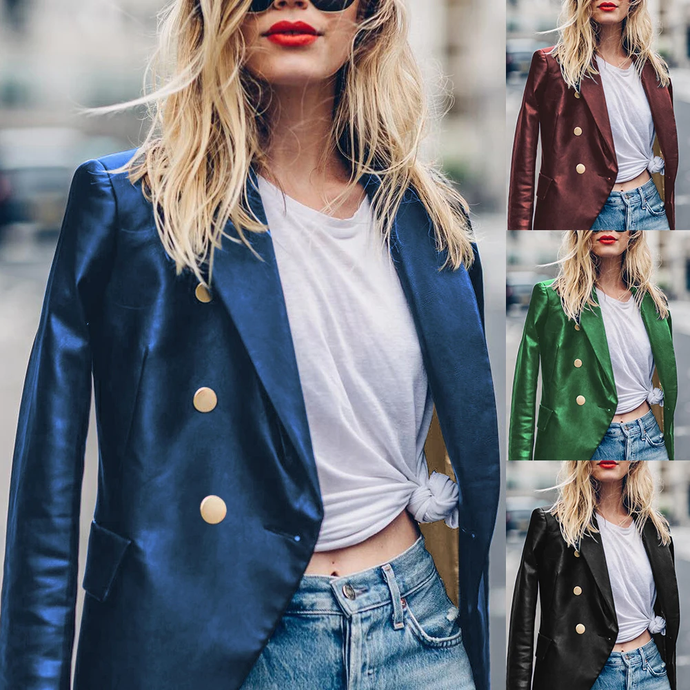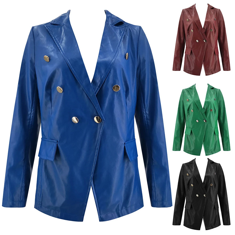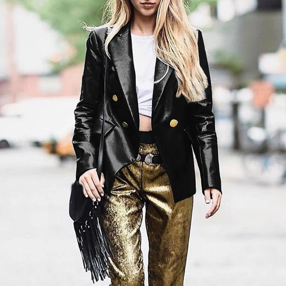 Женский Осенний сплошной цвет искусственная кожа двубортный лацкан Блейзер пиджак костюм