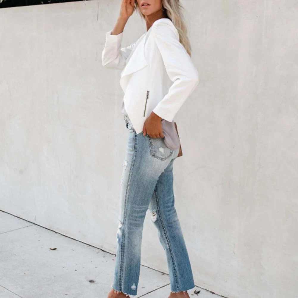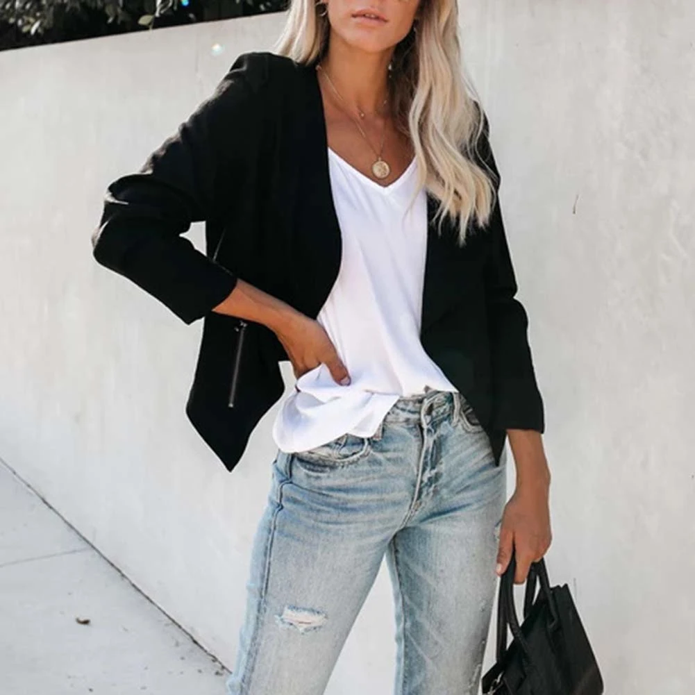 Женская мода осень сплошной цвет лацканы с длинным рукавом куртка пальто с карманами на молнии