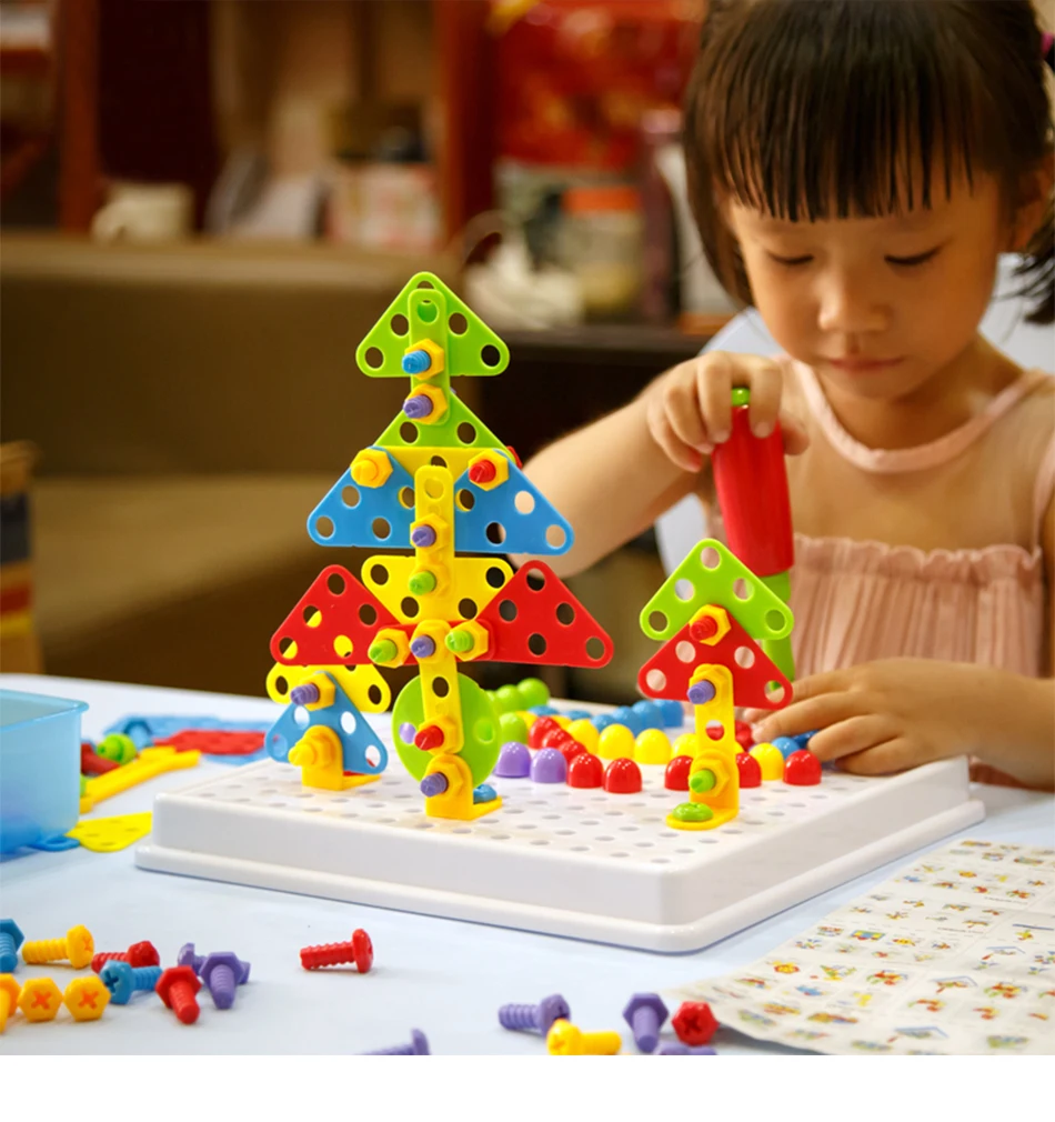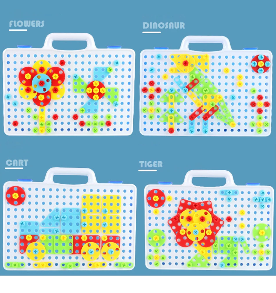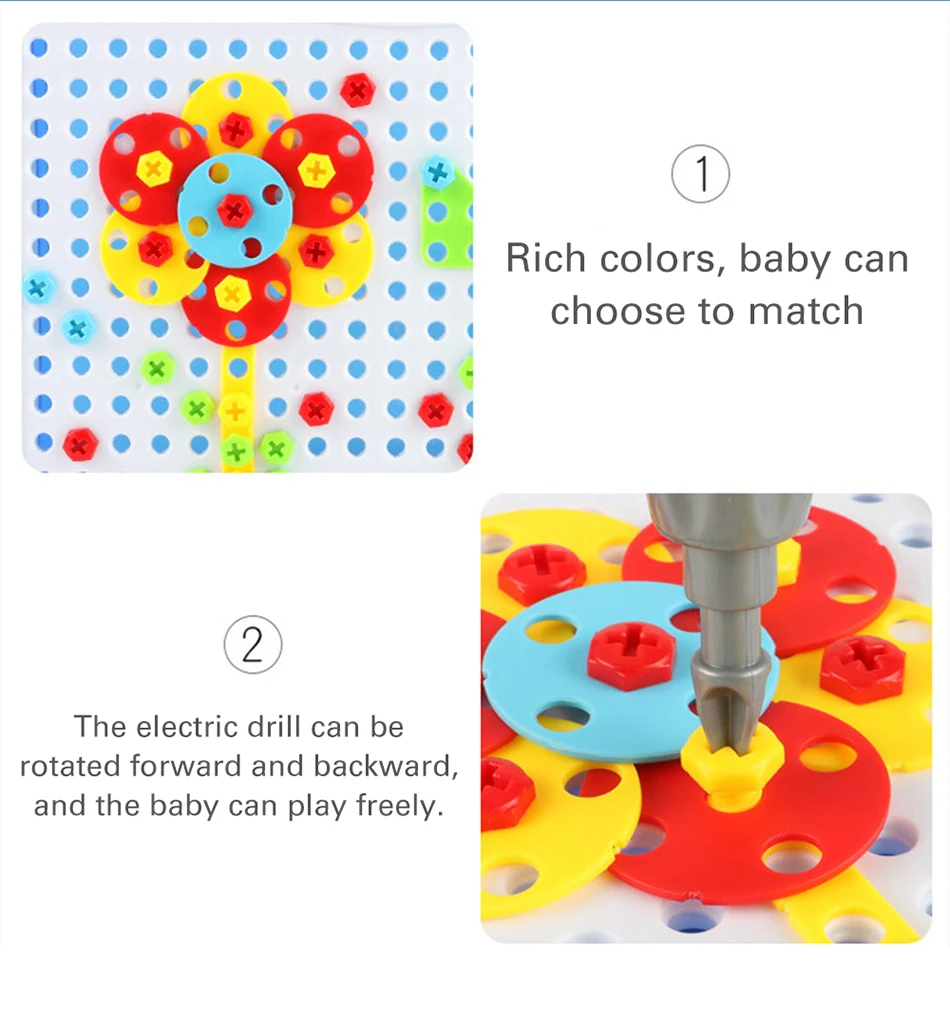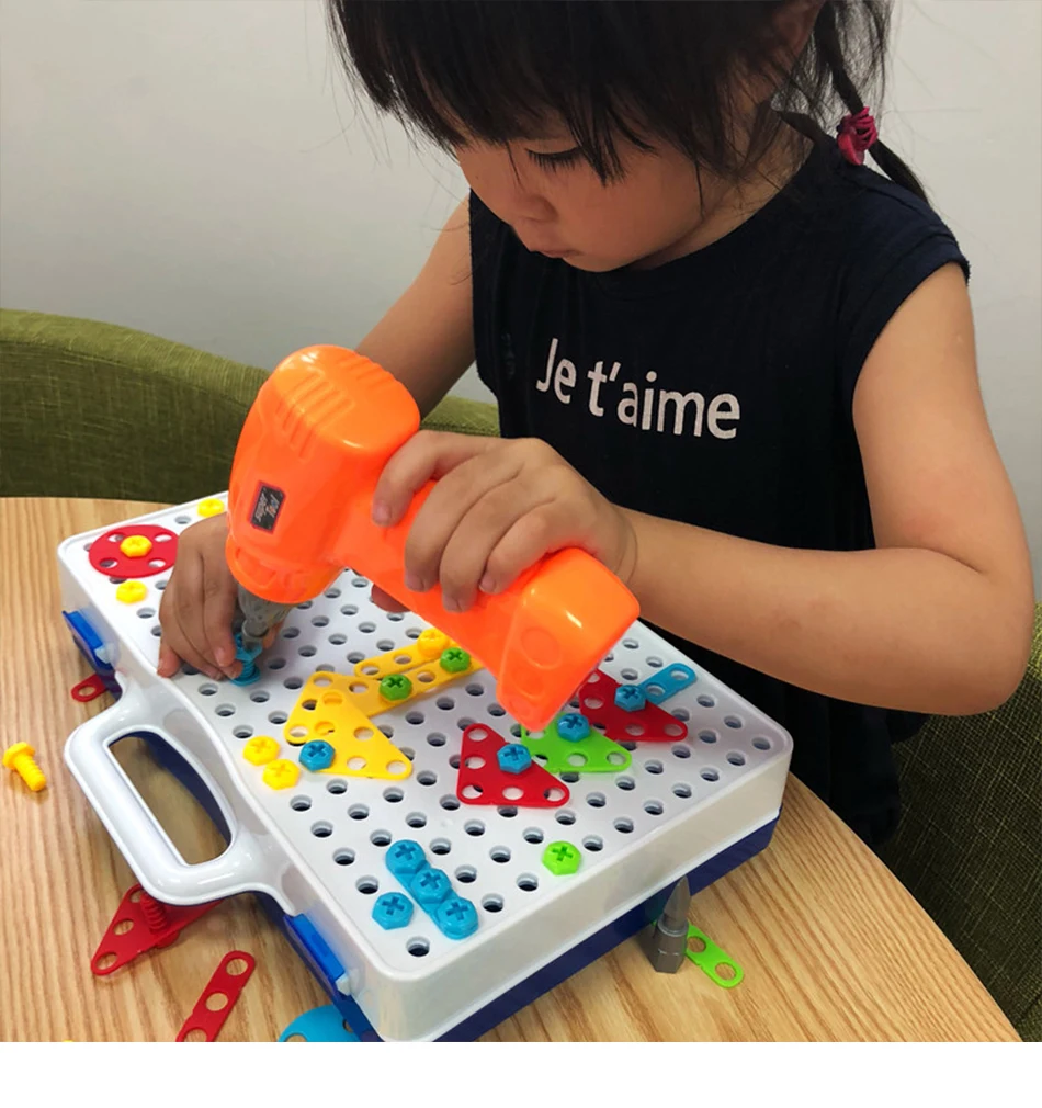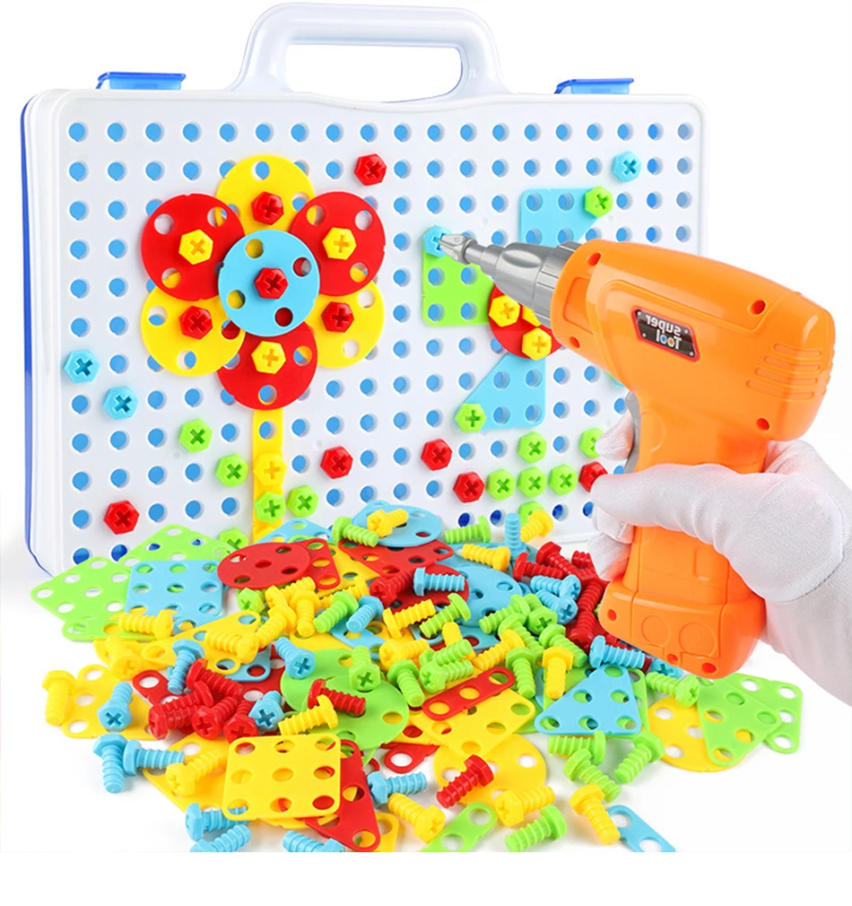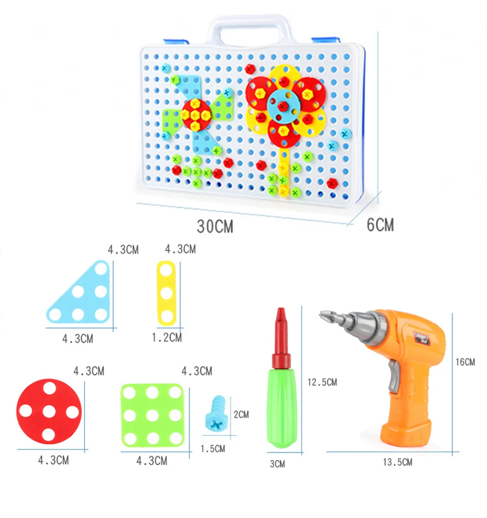 Кол-во аксессуаров: 149 шт пластиковая форма, 1 имитация электрическая дрель (без батареи); Руководство, 1 шт. отвертка 1 руководство по эксплуатации 1 коробка для хранения