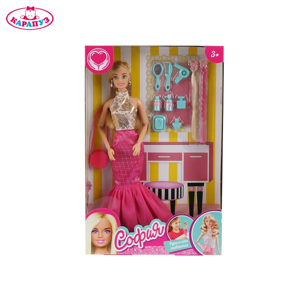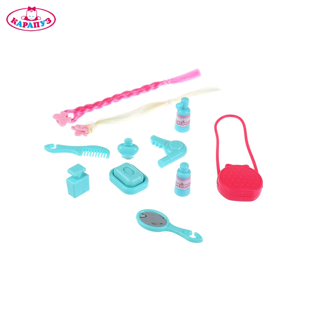 - С 10-ю дополнительными аксессуарами: две косички, фен, духи, зеркальце, расчёска и другие.