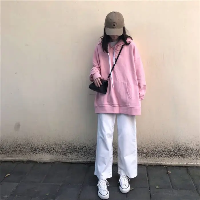 Однотонные толстовки с капюшоном для женщин, большие карманы, Harajuku толстовки, винтажные пуловеры с длинными рукавами, свободная повседневная одежда W051