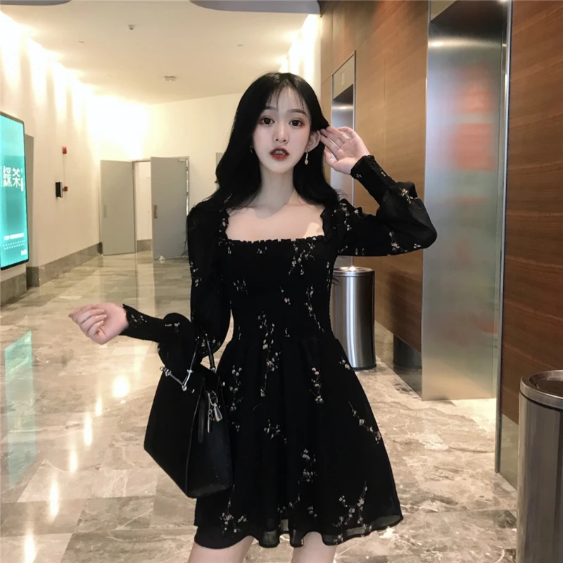 Летнее женское винтажное платье с цветочным принтом, черное праздничное платье с длинным рукавом, корейское повседневное мини-платье, Пляжное богемное эластичное платье с вырезом лодочкой W089