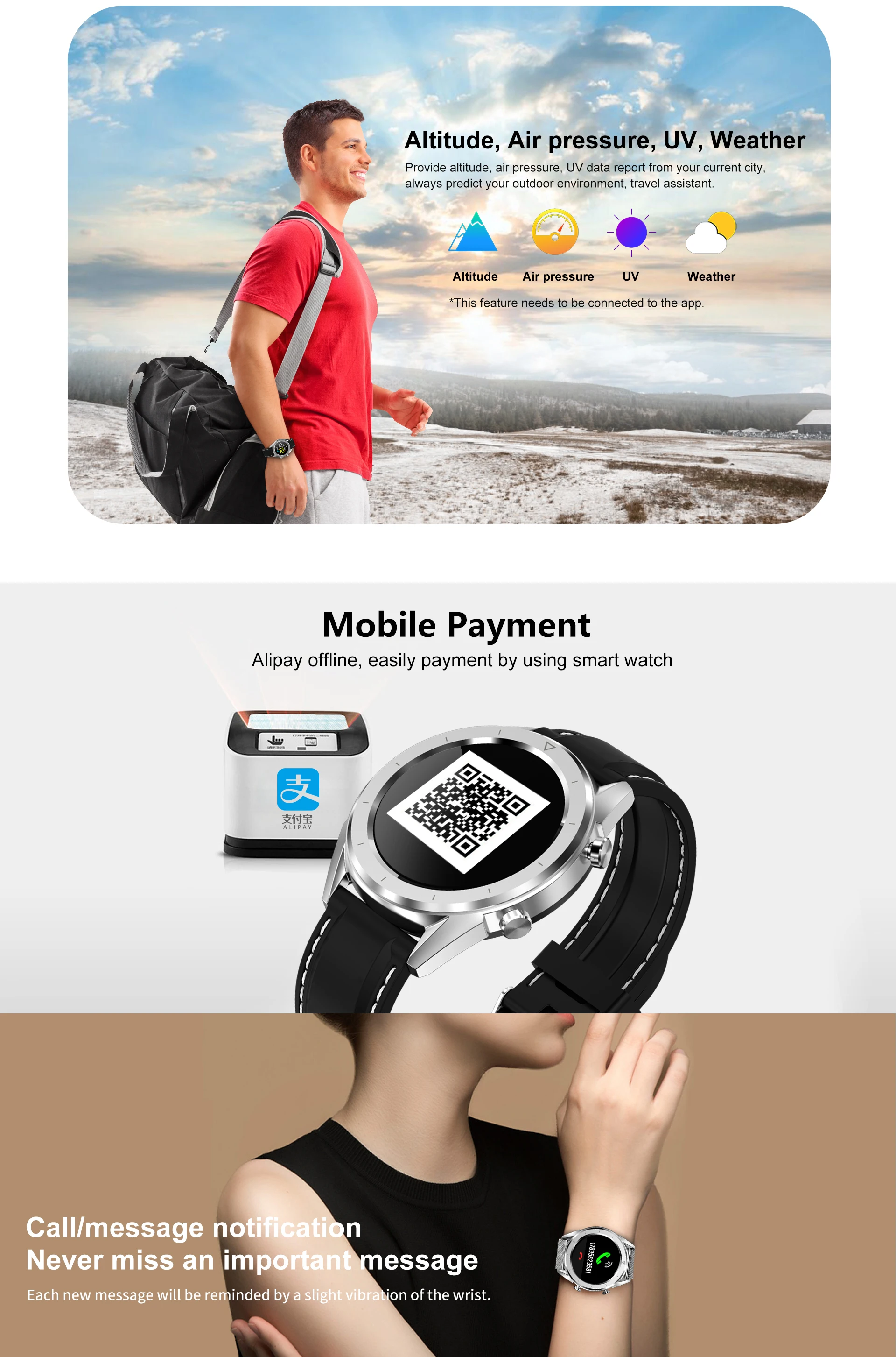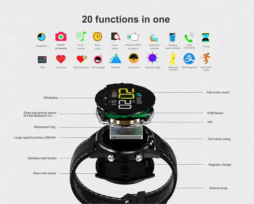 "Частота сердечных сокращений, ЭКГ, кровяное давление, уровень кислорода в крови, Несколько видов спорта: ходьба, бег, Велоспорт, плавание, туризм, баскетбол, бадминтон, настольный теннис, футбол. Высота, давление воздуха, УФ, погода (нажмите через сеть) Шаг, секундомер, удаленная фотография, управление музыкой Мониторинг сна, напоминание о сидячем положении, напоминание о питье, просмотр информации и т. д. (Доступно после подключения Bluetooth)"