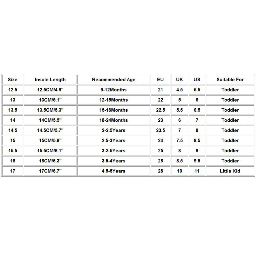 Размер Стельки Длина Рекомендуемый возраст ЕС Великобритания Свяжитесь с нами Подходит для 12,5 12,5 см/4,9" 9 to 12 months 21 4,5 5,5 Для детей ясельного возраста 13 13 см/5,1" 12-15Months 22 5 6 Для детей ясельного возраста 13,5 13,5 см/5,3" 15-18Months 22,5 5,5 6,5 Для детей ясельного возраста 14 14 см/5,5" 18-24Months 23 6 7 Для детей ясельного возраста 14,5 14,5 см/5,7" 2-2.5Years 23,5 7 8 Для детей ясельного возраста 15 15 см/5,9" 2,5, для возраста до 3 лет 24 7,5 8,5 Для детей ясельного возраста 15,5 15,5 см/6,1" 3-3.5Years 25 8 9 Для детей ясельного возраста 16 16 см/6,3" 3,5-4 лет 26 8,5 9,5 Для детей ясельного возраста 17 17 см/6,7" 4,5-5 лет 28 10 11 Для маленьких детей
