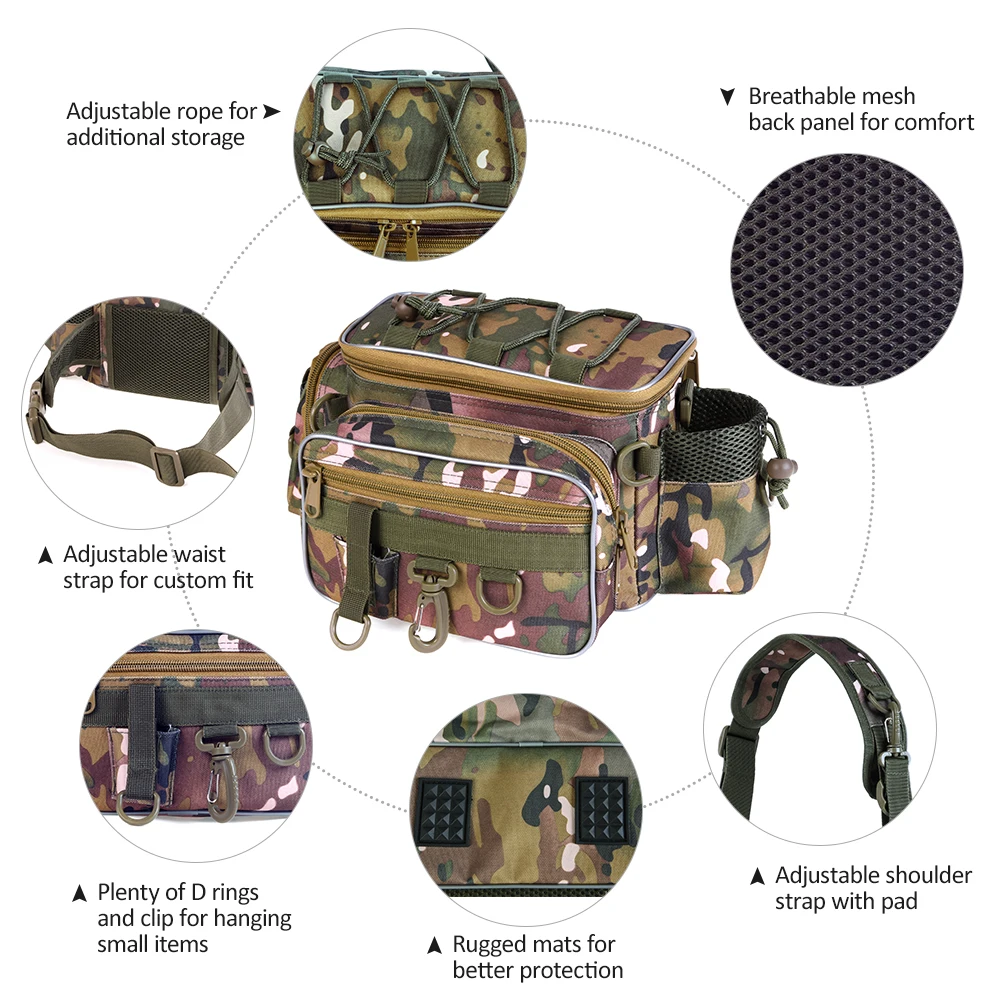 Эта Рыболовная Сумка специально разработана для рыбаков. Он включает в себя просторное основное отделение и несколько внешних карманов, достаточно вместительный, чтобы держать ваши стандартные рыболовные снасти организованными и готовыми к любой рыбалке. Он идеально подходит для хранения рыболовных приманок, катушки, плоскогубцев, коробок для снастей, ключей, кошельков и других аксессуаров.