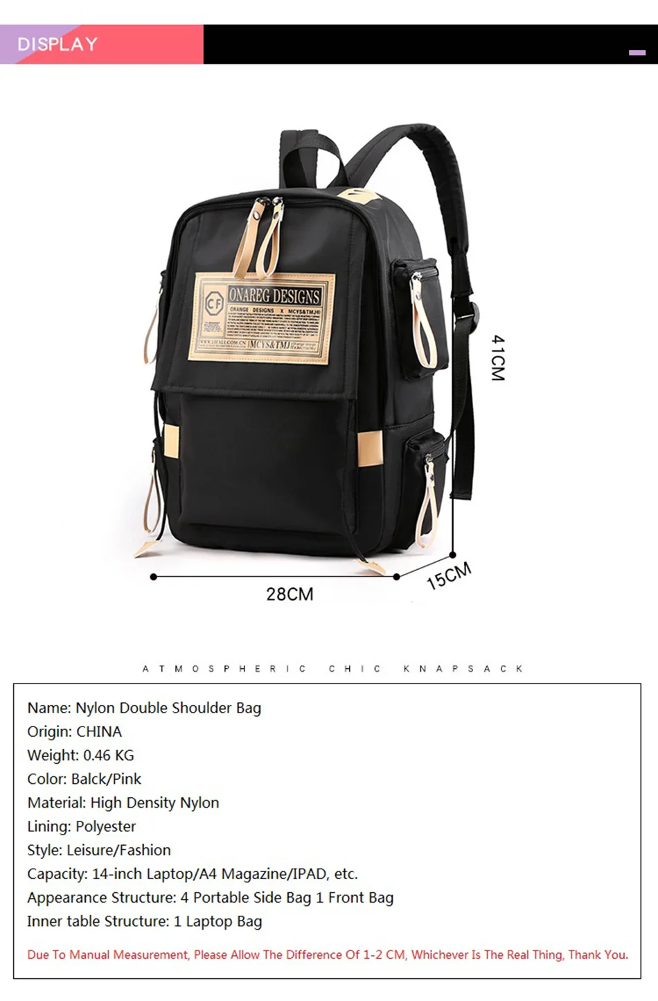 Материал: высококачественный водонепроницаемый нейлон Подкладка: полиэстер Страна происхождения: Китай (материк) Цвет: черный/розовый Размер: 28 см * 15 см * 41 см Характеристики: Водонепроницаемость/Большая емкость Стиль: Модный/спортивный Вес: 0,46 кг Стиль сумки: двойное плечо Внешний вид: 4 переносных боковых кармана/1 передний карман Внутренняя структура стола: 1 ноутбук/основной карман Способ открытия и закрытия: молния Подходит для: путешествий, покупок, работы, спорта и т. д. Примечание: Из-за воздействия освещения и разных дисплеев цвет немного отличается, но это съемка. Из-за ручного измерения, пожалуйста, учитывайте разницу в 1-2 см, в зависимости от того, что является реальной вещью, спасибо.